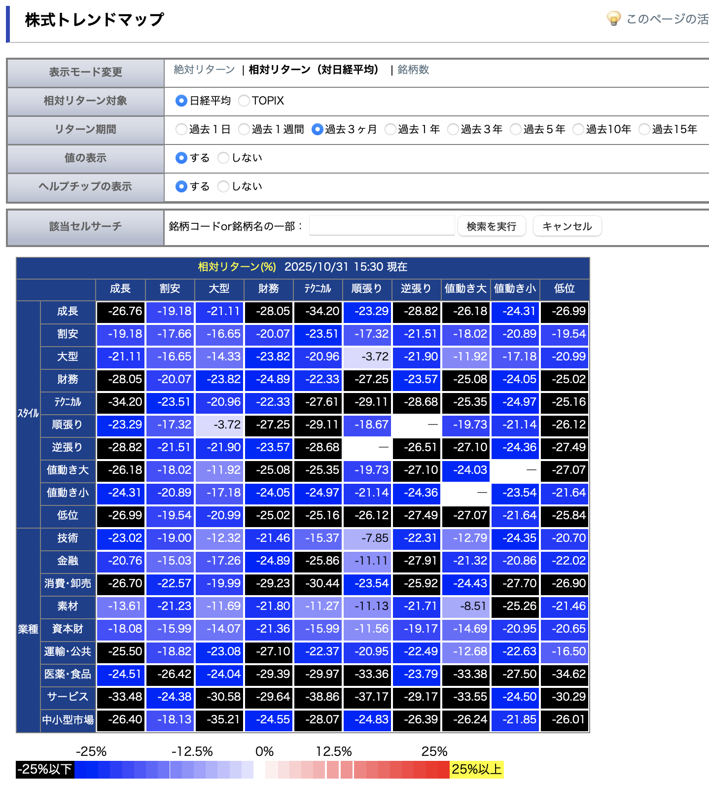 足元3カ月(8〜10月)の相対リターンを見てみると、全部のファクターが日経平均に列語しています。大体20〜30%くらい劣後していますね。