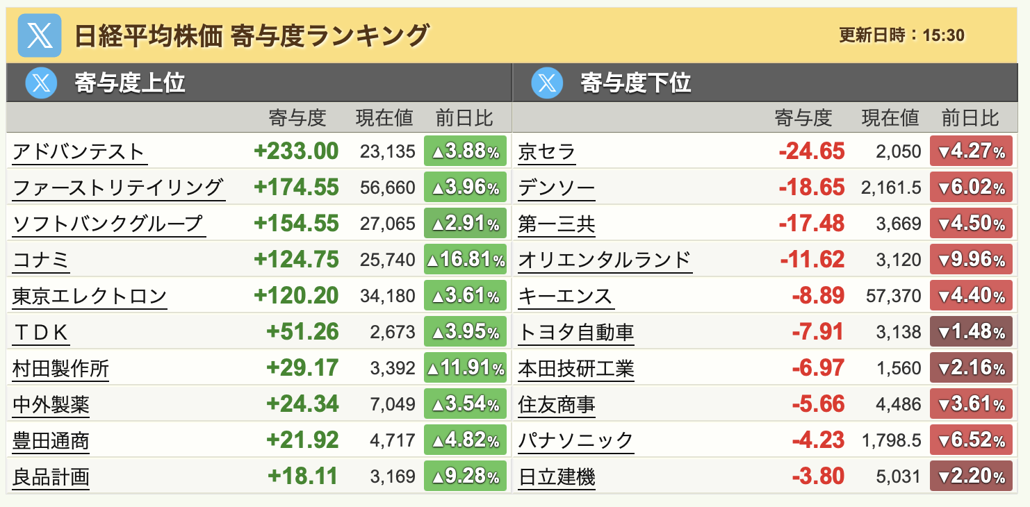 寄与度ランキングを見てみると、相変わらずAI一色という感じですね。今日はファーストリテイリングも好調で、指数を押し上げています。