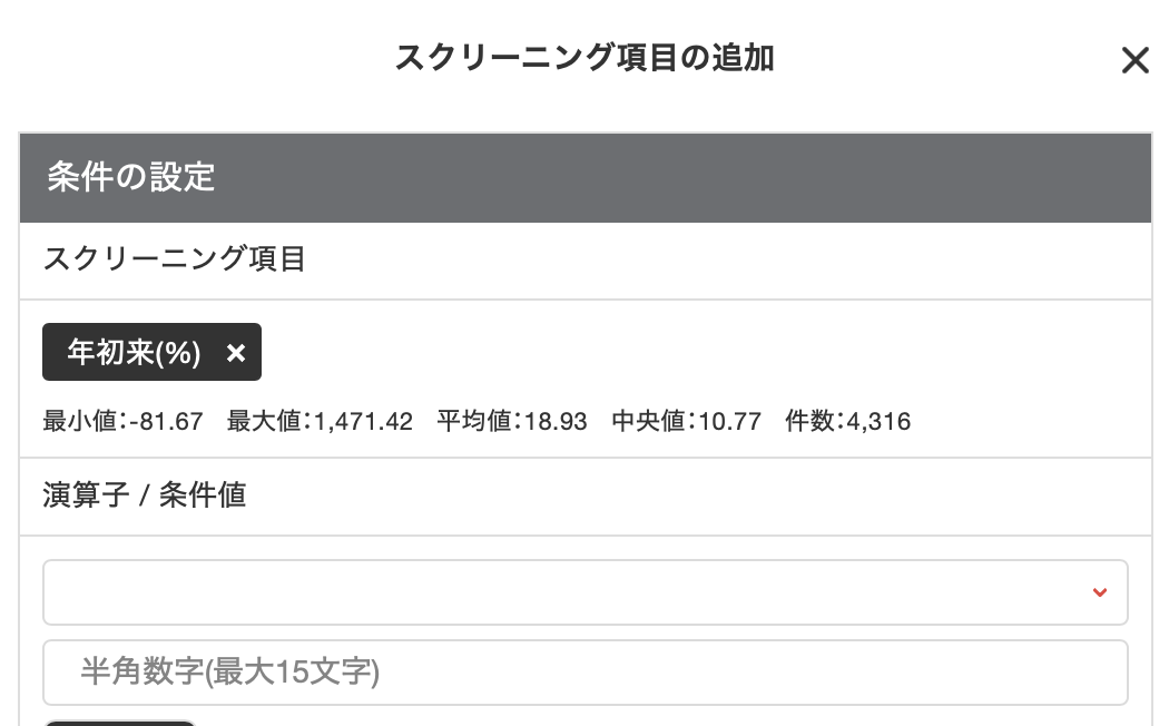 ためしに四季報オンラインのスクリーニング機能で年初来リターンの平均値や中央値を調べてみました。