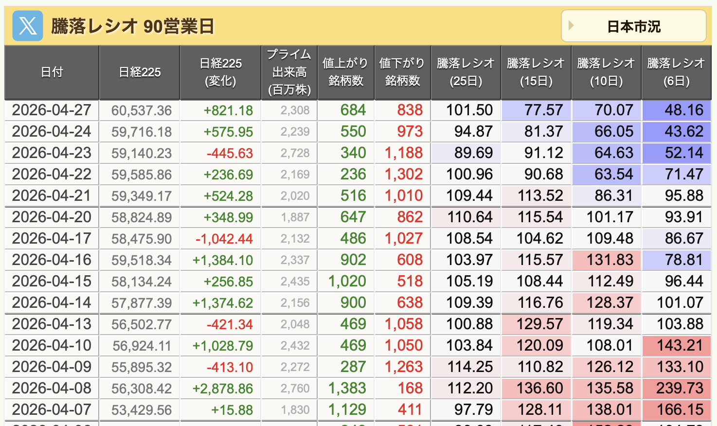 騰落レシオも、相変わらず低いままです。そろそろセクターローテーションがあるんじゃないかという気がしますが、AI熱がそれだけ凄まじいってことなんでしょうね。