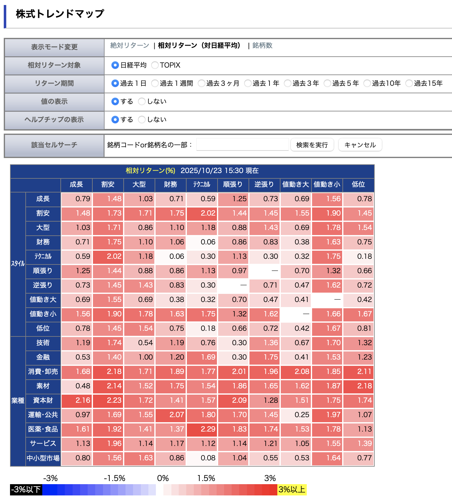 ただ、指数が下がった割に、個別株は元気ですね。株マップを見てみても、今日は指数を上回った株が多いようです: