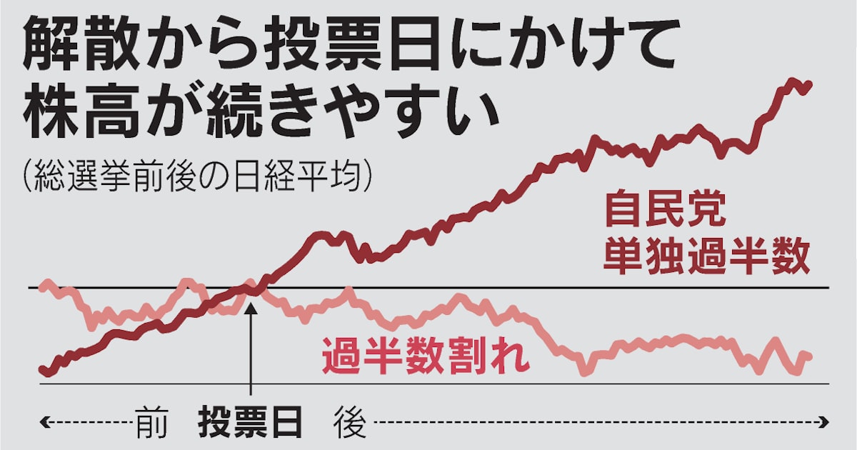 岩井コスモ証券の林卓郎・投資情報センター長が1993年以降に10回あった総選挙前後の日経平均の動向を分析したところ、解散当日から投票日までは10回とも株価が上昇していた。自民党が単独で過半数の議席を獲得できた場合はさらに選挙後も株高が続く傾向にあった。