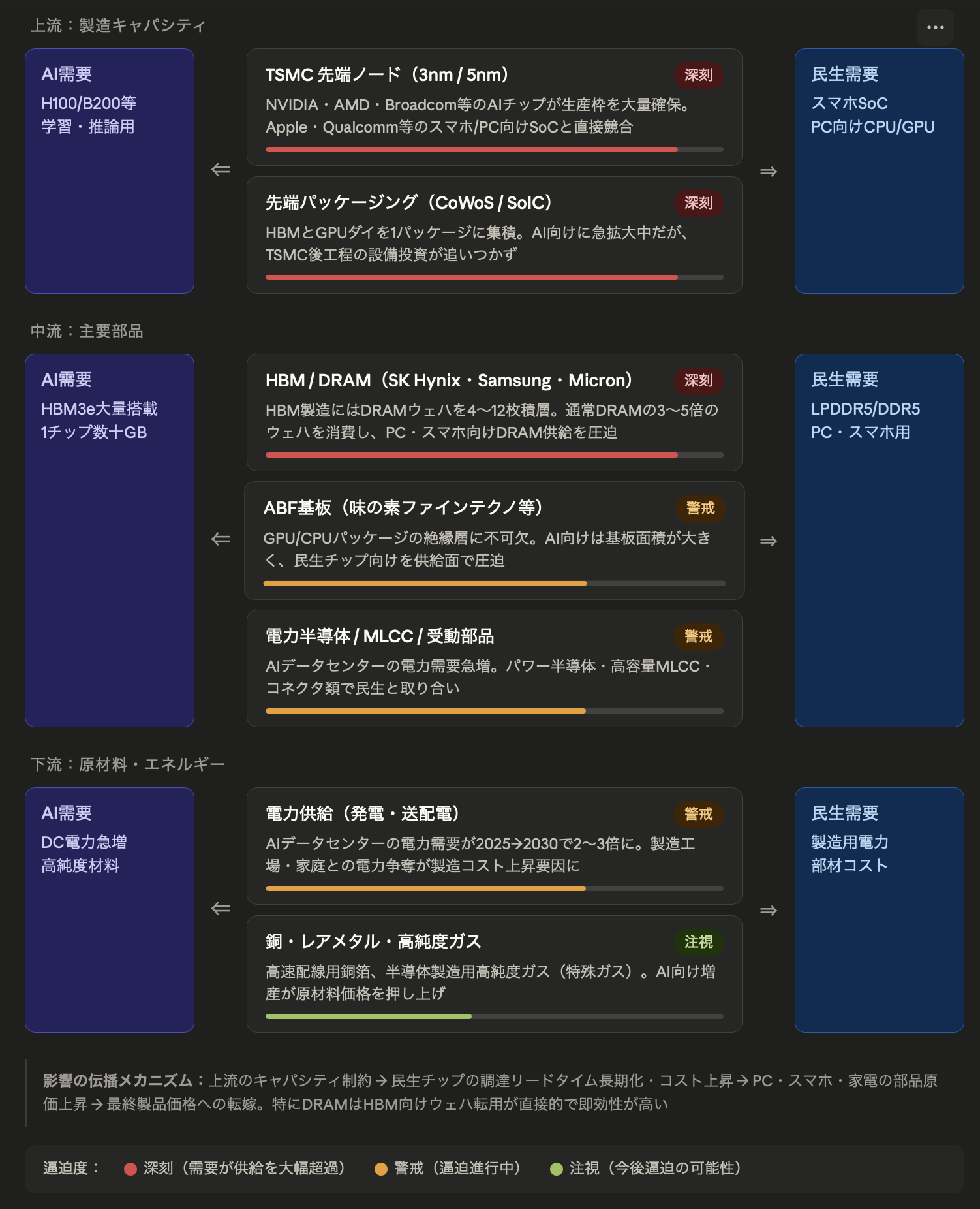 ざっくりインパクトを見てみると、現状のボトルネックは先端ノード、先端パッケージング(CoWoS)、HBMやDRAMの不足だと思われます。