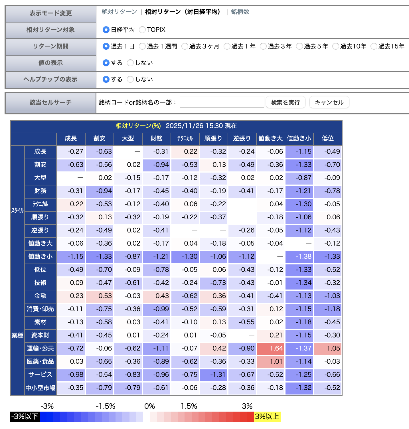 株式トレンドマップを見てみると、11/26は日経平均株価が特に強かったようです。