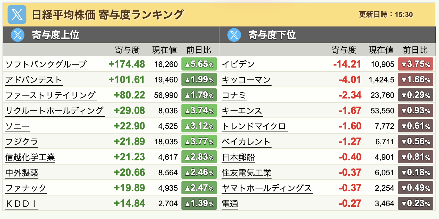 寄与度別ランキングを見てみると、ソフトバンクグループやアドバンテストが元気でした。下火だったAIブームが、少しずつ回復してきているように見えます。