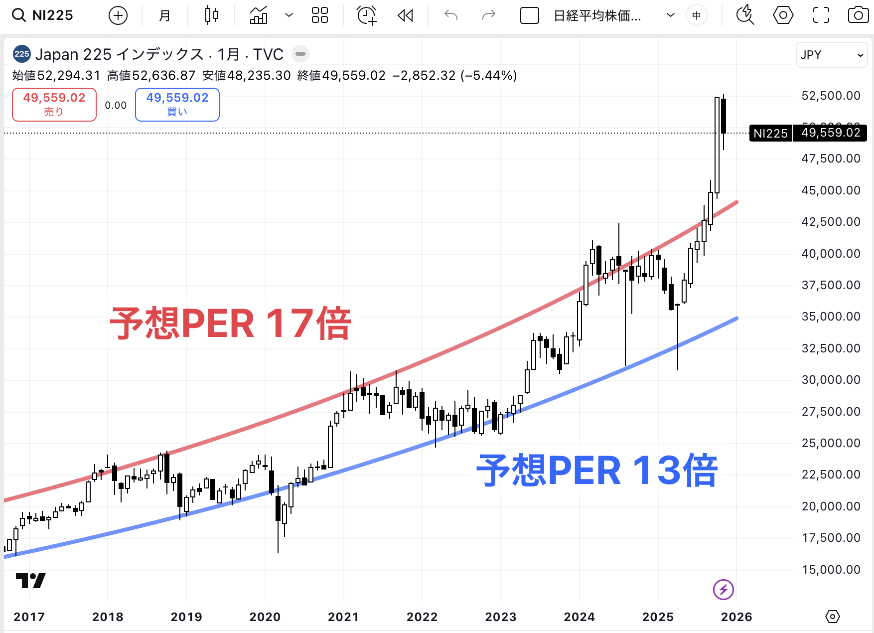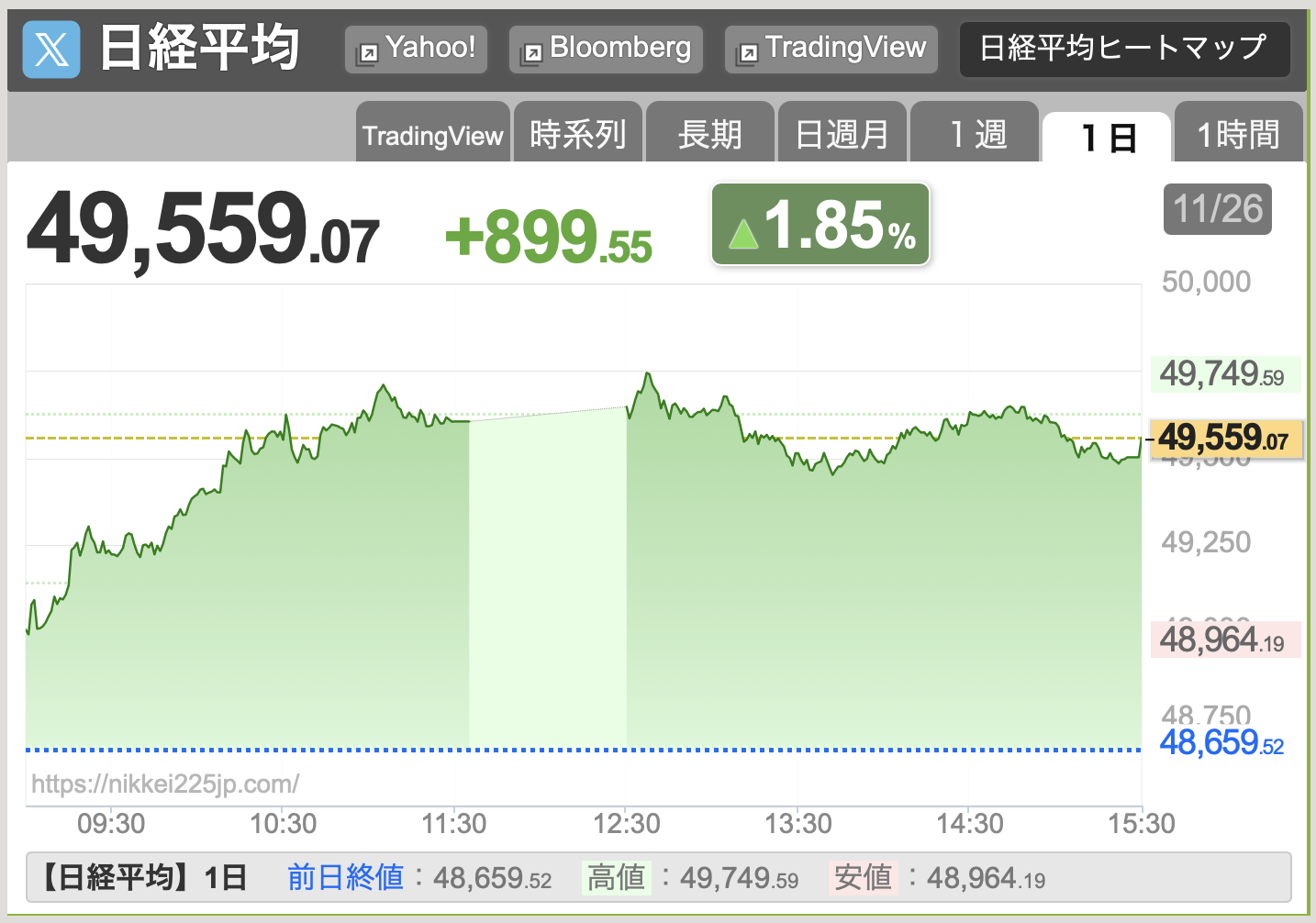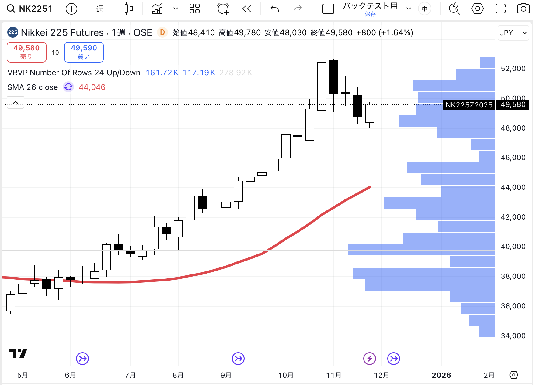 11/26時点、日経終値は49580円です。まだかなり高いですね。