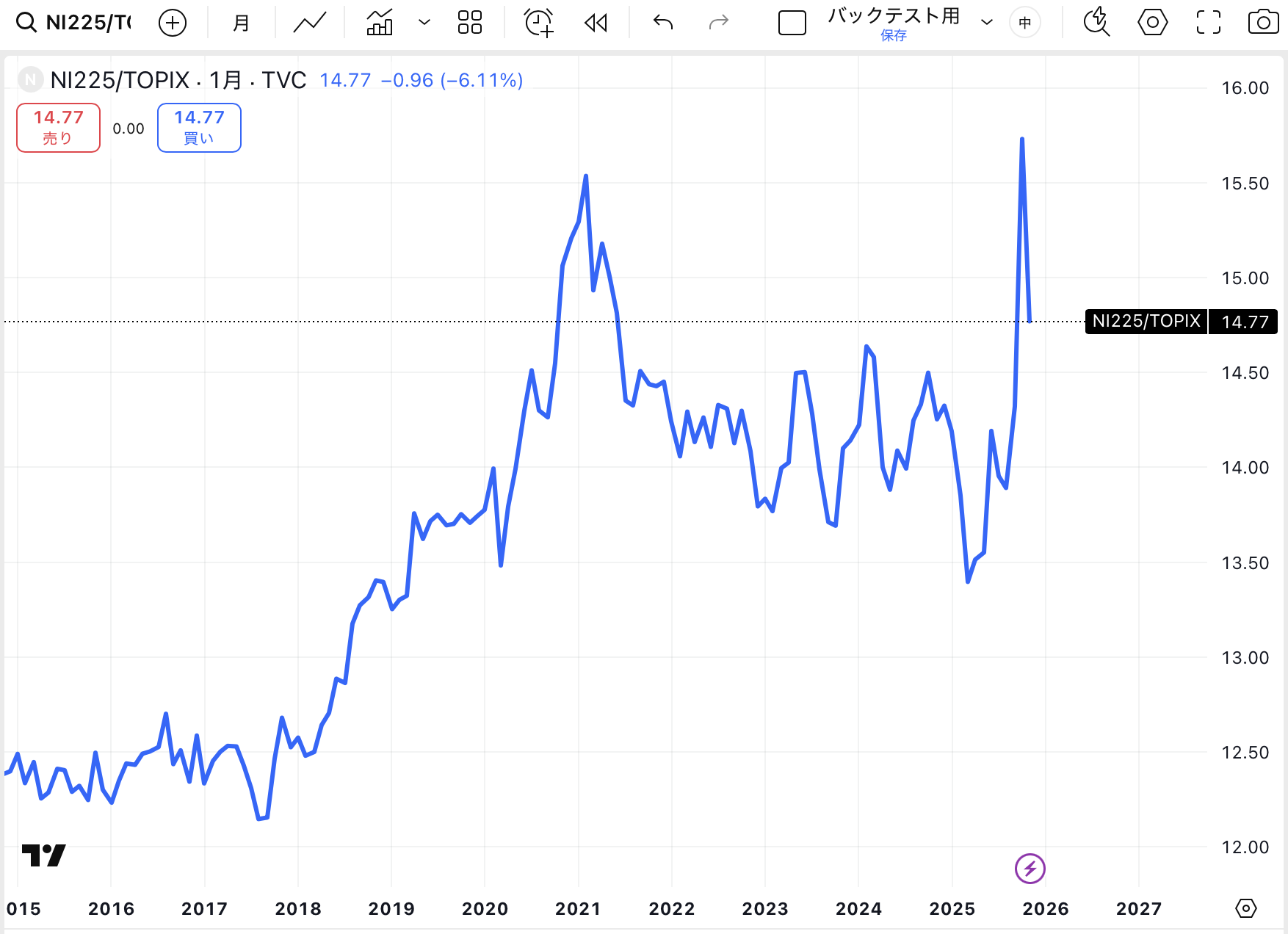 NT倍率(日経平均株価÷TOPIX)のチャートを描いてみると、相変わらず高値圏にあります。