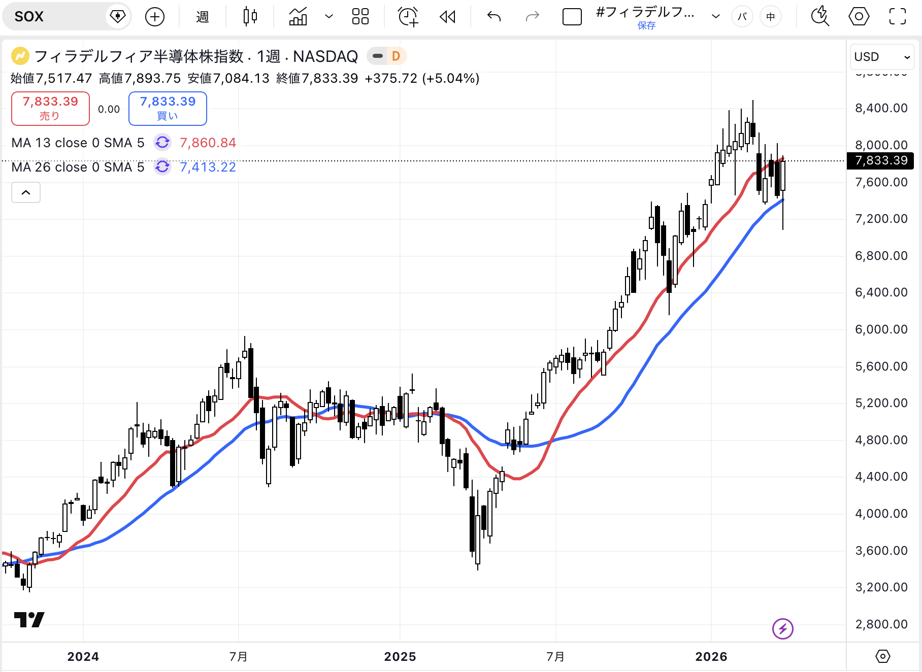 SOXは赤いライン(13週)を下回っていますから、「チャートが崩れた」と言えば、そう見えますね。