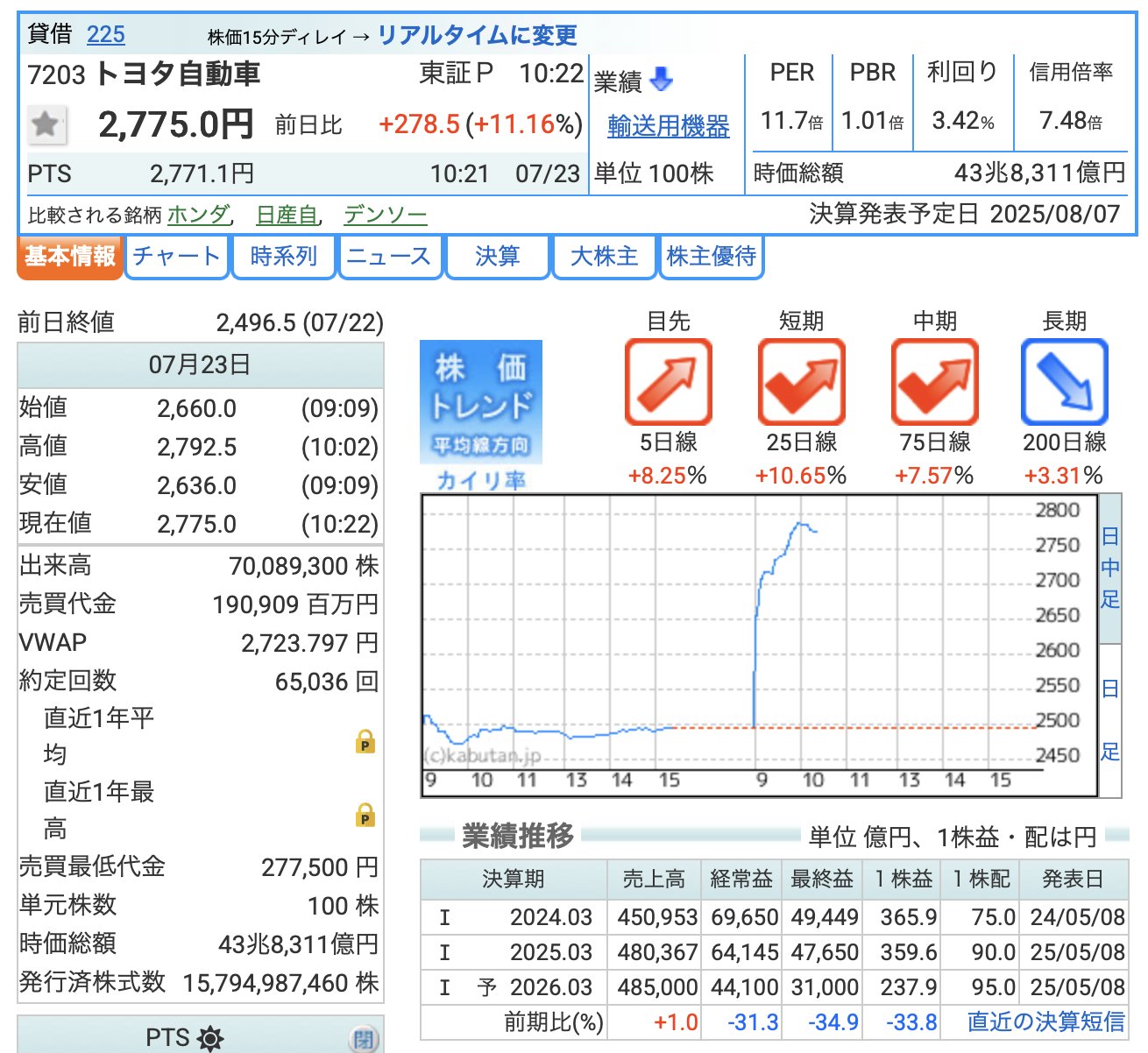 寄り付き直前に急に上がり始めたので「どうした?」と調べてみると、トランプ関税が15%に引き下げられるというニュースが出ていました。