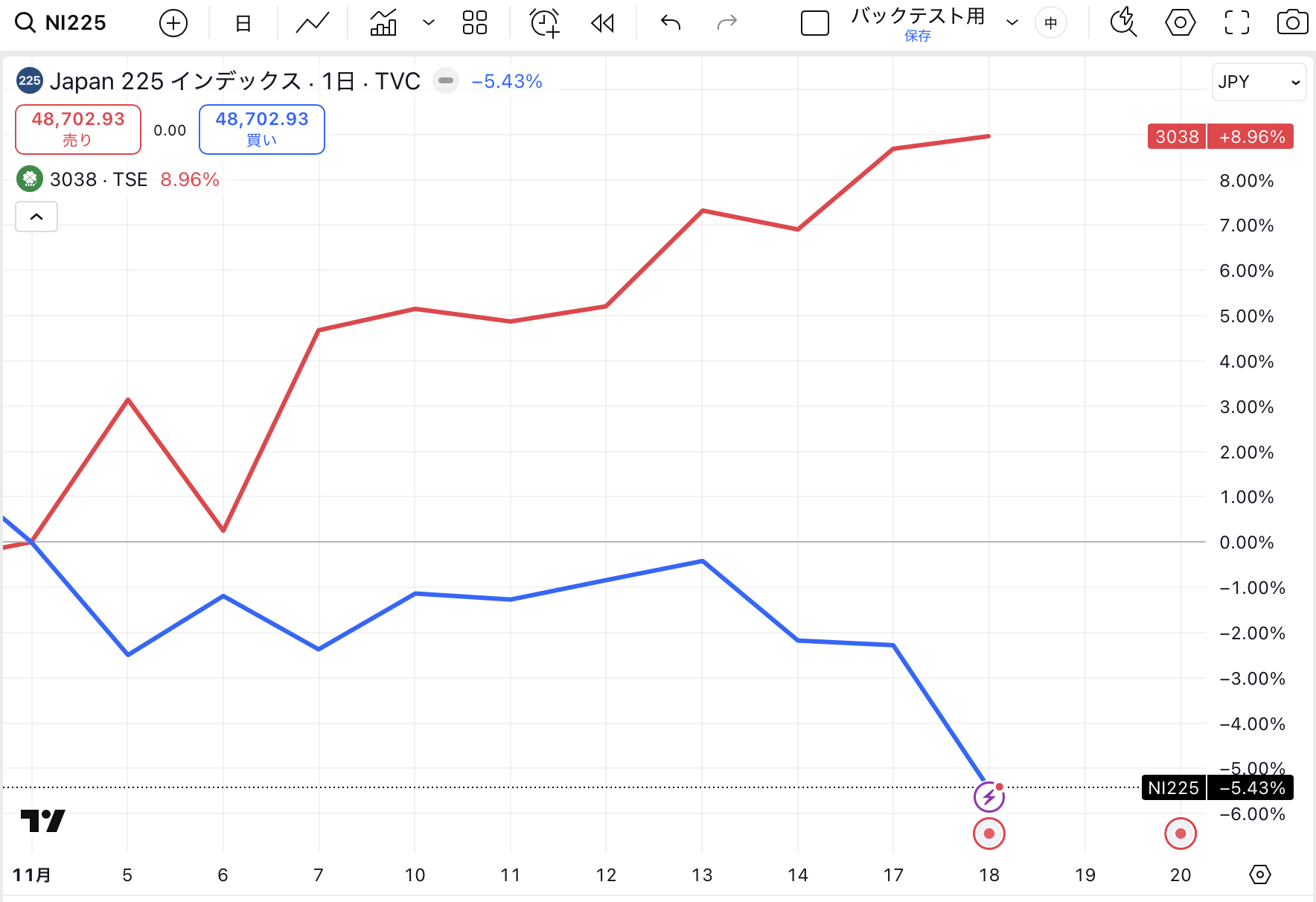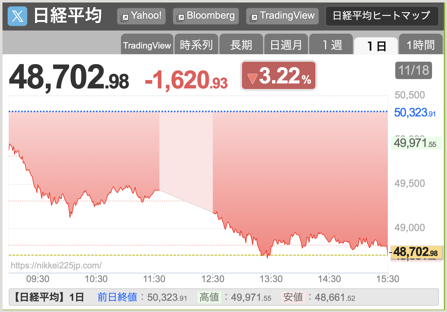11/18時点、日経終値は48702円です。下がったとはいえ、まだかなり高いですね。