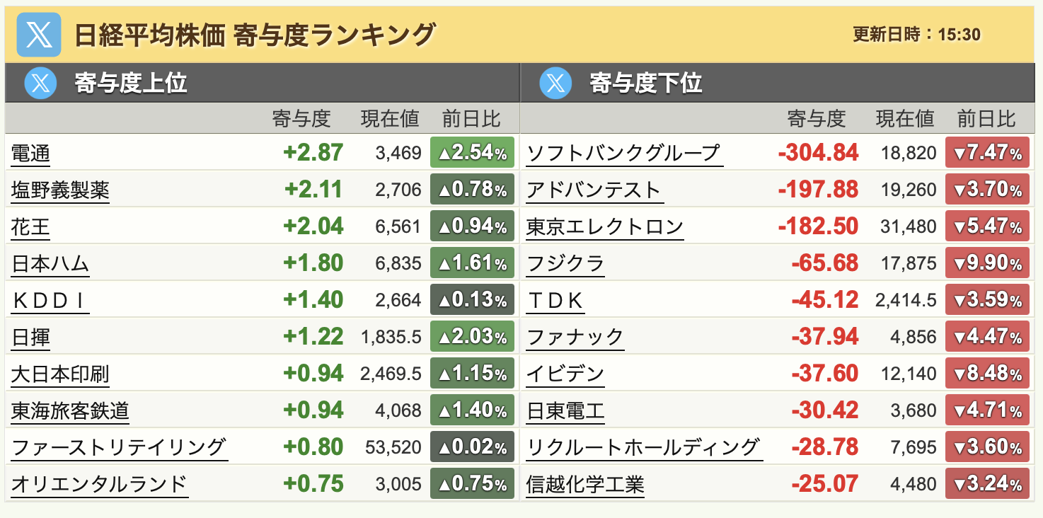 寄与度ランキングを見てみると、昨日とは一転してAI関連株が軒並み下がっていました。