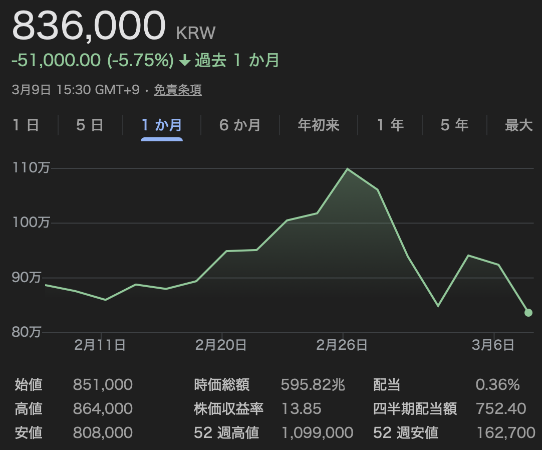 とはいえ、下がってはいますが「メモリ半導体が足りない状況はしばらく続く」のはほぼ確定だと思うので、別に売ったりはせず、放置ですね。