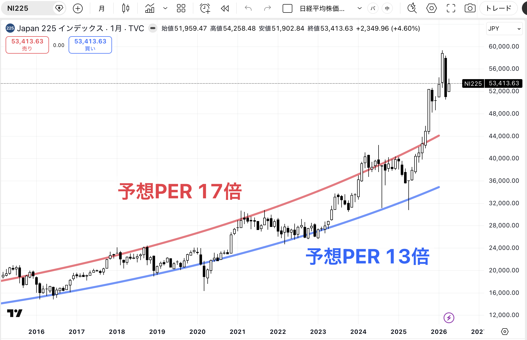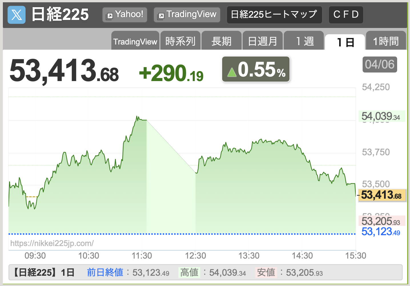 4/6時点の終値は53,413円です。