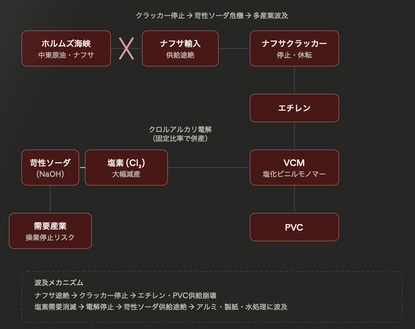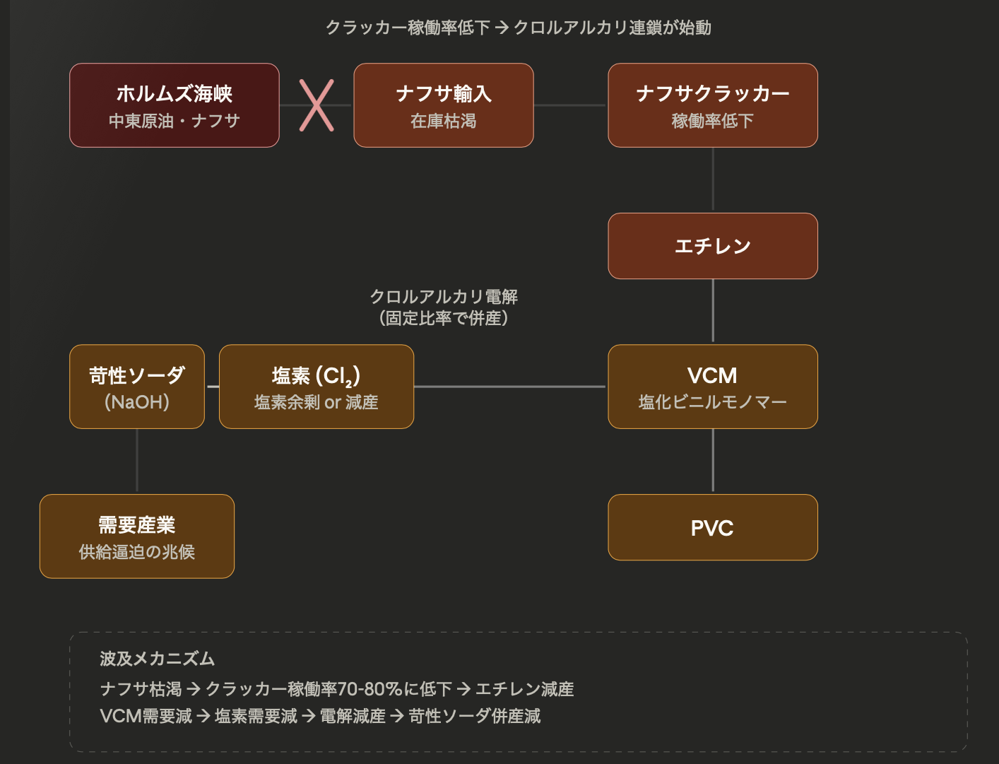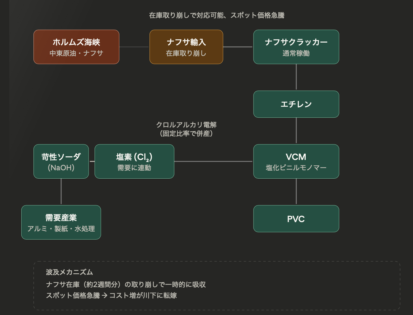 封鎖期間が伸びた場合、ナフサが足りなくなり、エチレンなどの基礎化学品(エチレン、プロピレン、BTXなど)が不足し始め、製造業全体へと影響が伝播していきそうです。