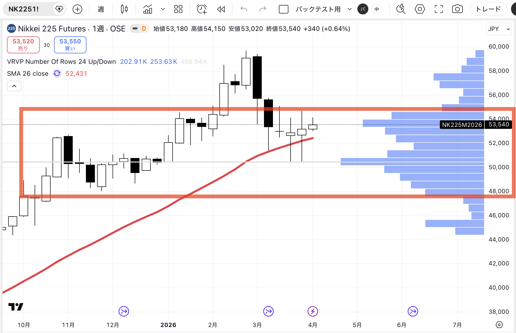 まずは週足チャートで需給をチェックします: