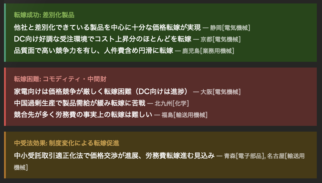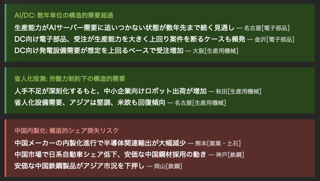 あと、やはりAI周りは強いですね。AI向けデータセンター向けは価格てんかもできているようですし、電子部品や、発電設備需要なども旺盛のようです。