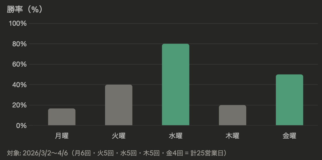 曜日別の勝率を見てみると、月曜に大きく下がる反動で、水曜日の勝率が突出して高いですね。