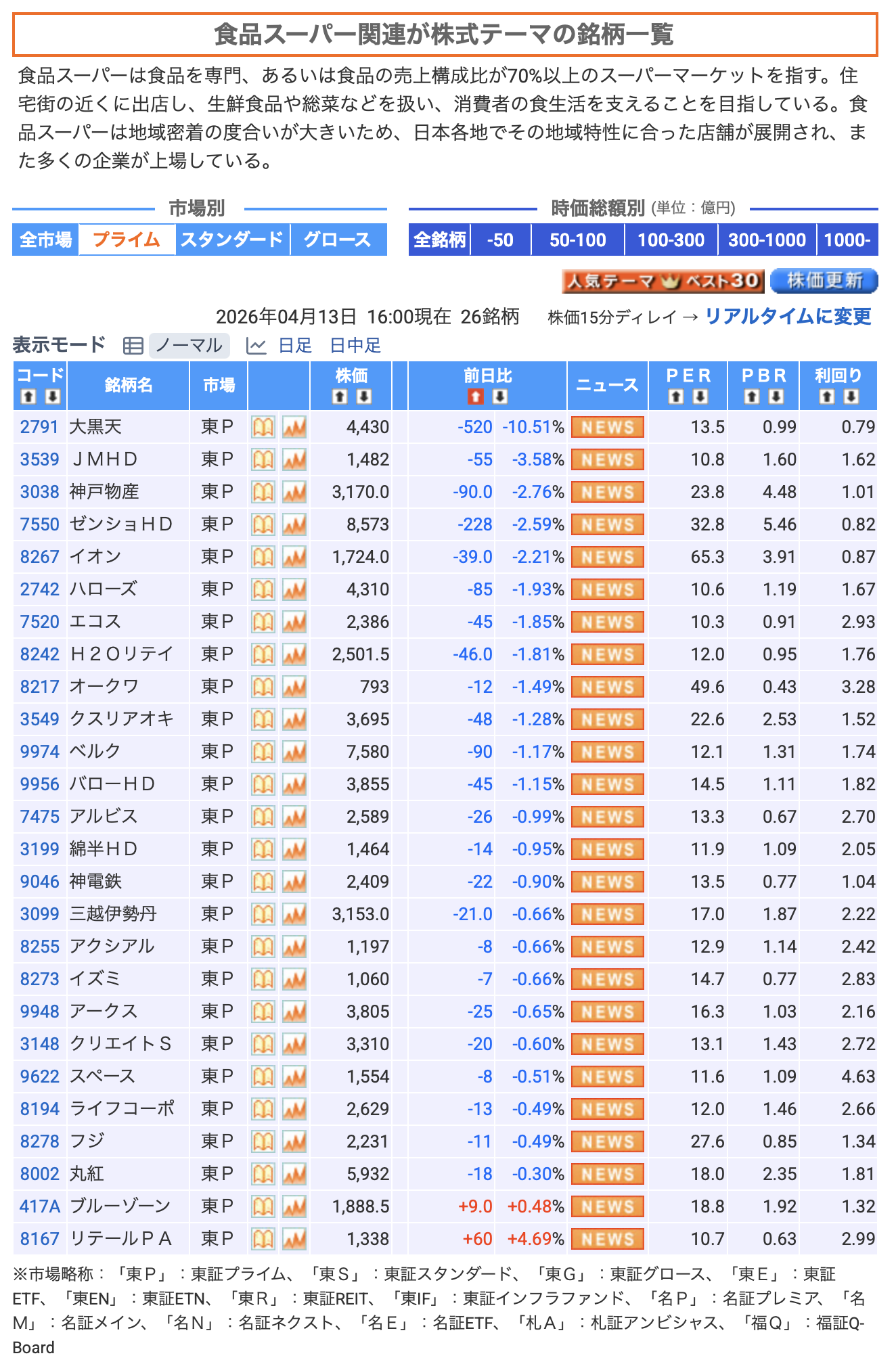 電気代やガソリン代の高騰などが嫌気されているのか、食品スーパーの株が軒並み安になっています: