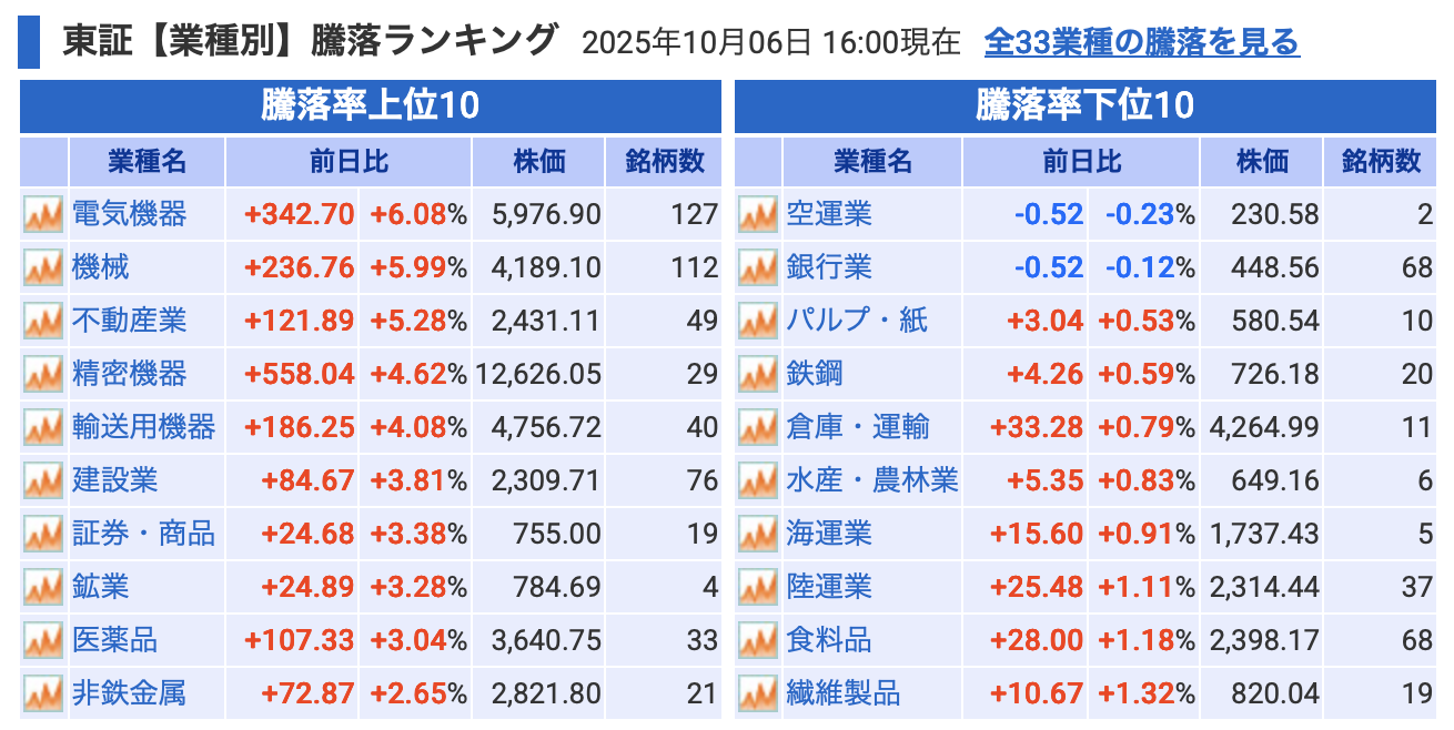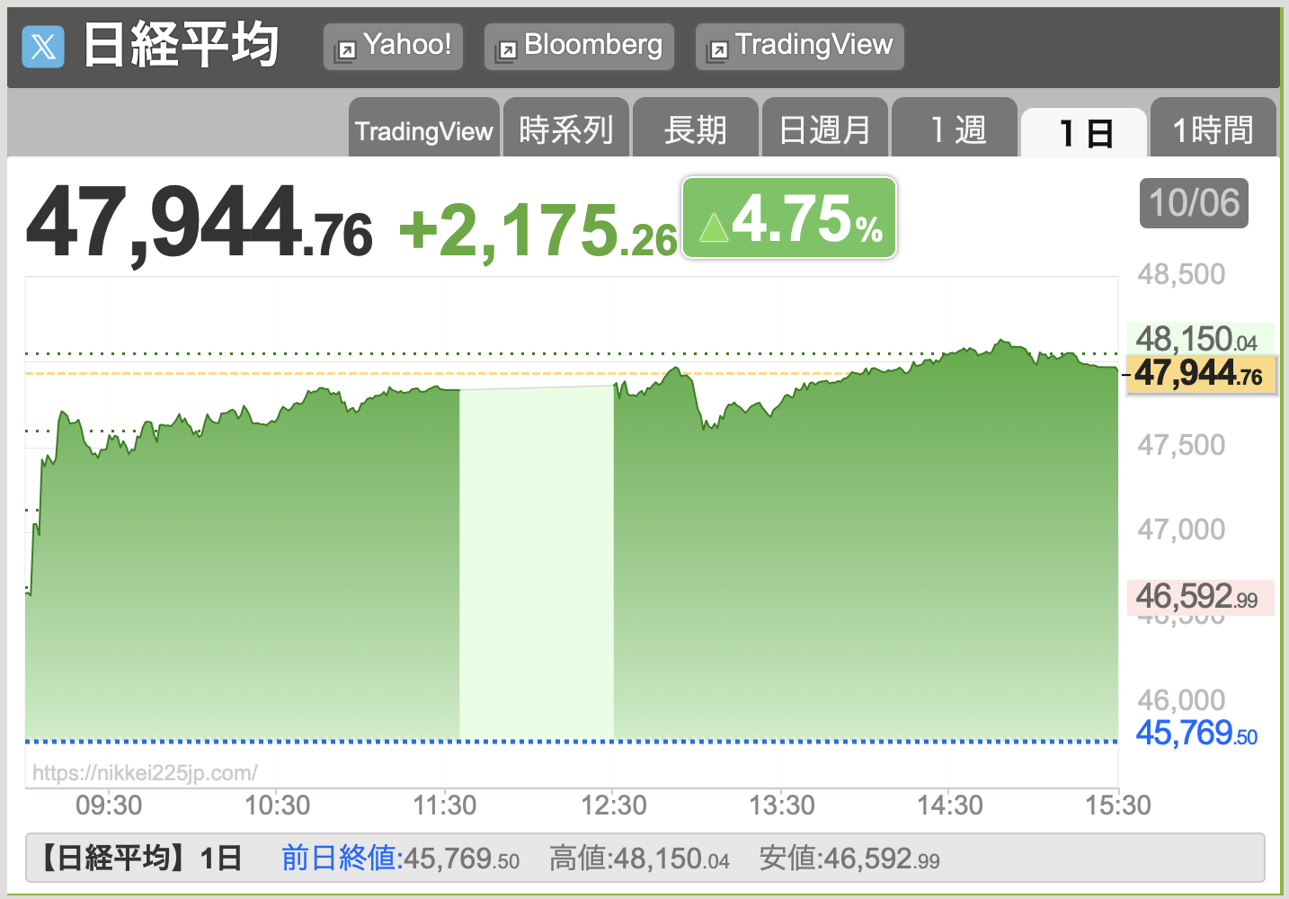 10/6、日経平均は一時48,000円を超えました。前日比は2,175円高。4.75%も上がりました🔥