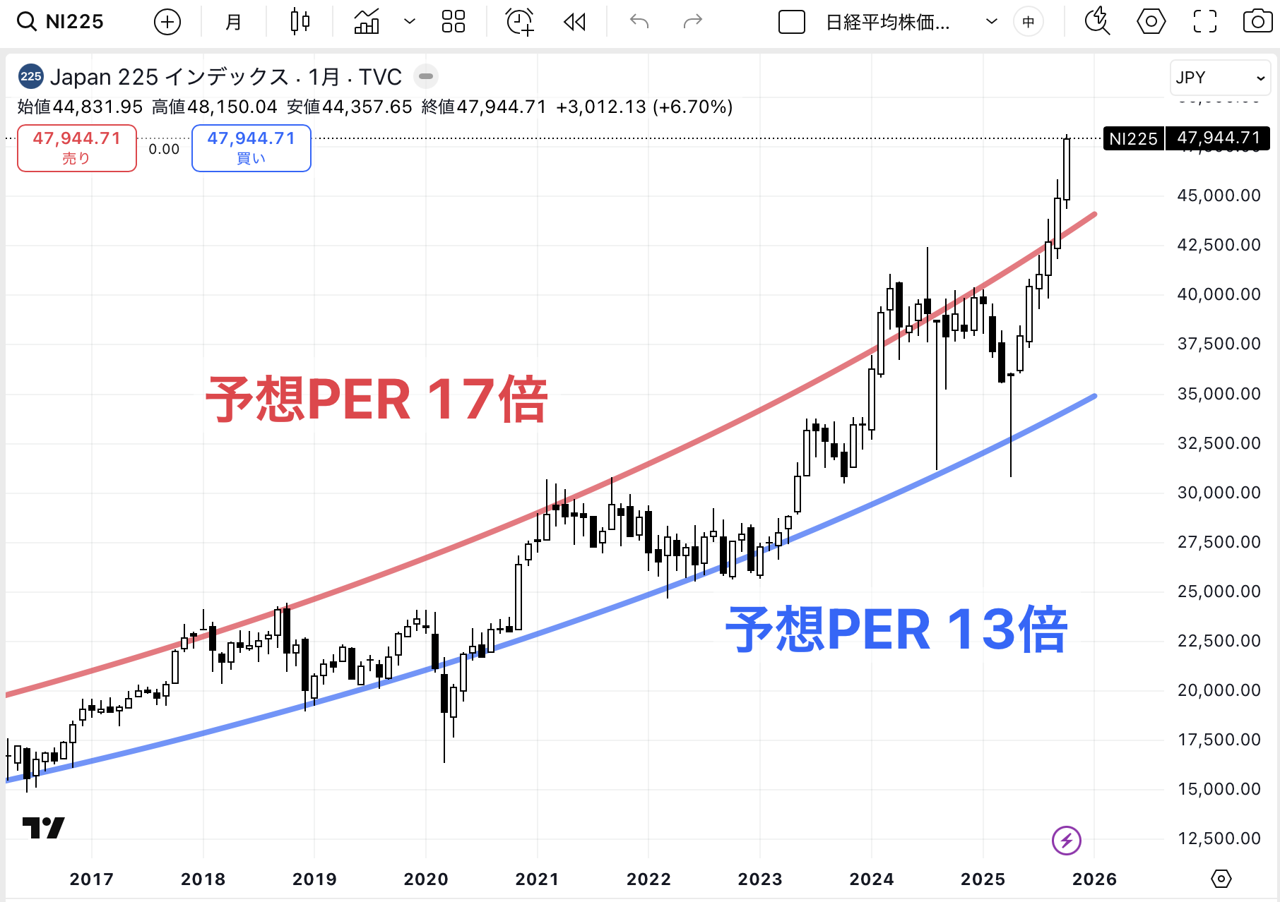 2025年10月時点の筆者の想定レンジは34000〜43000円です。10/6時点、日経終値は47944円です。「だいぶ高いな〜」と思います。