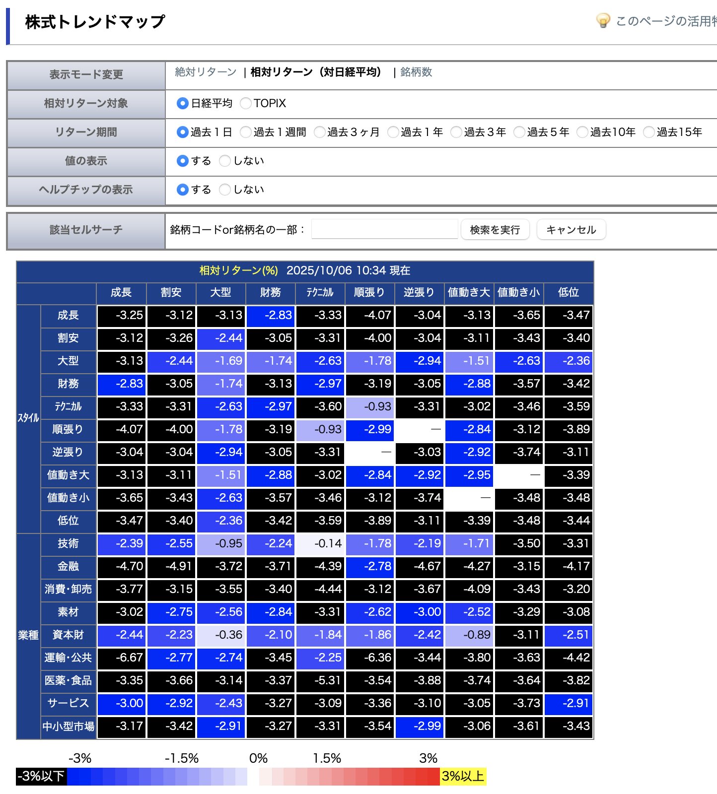 ザラ場中にXでポストしましたが、株式トレンドマップを見てみると、指数は上がっていても、個別株は全然ダメですね。大型株は若干マシですが、日経平均に対して3%ほど劣後しています。