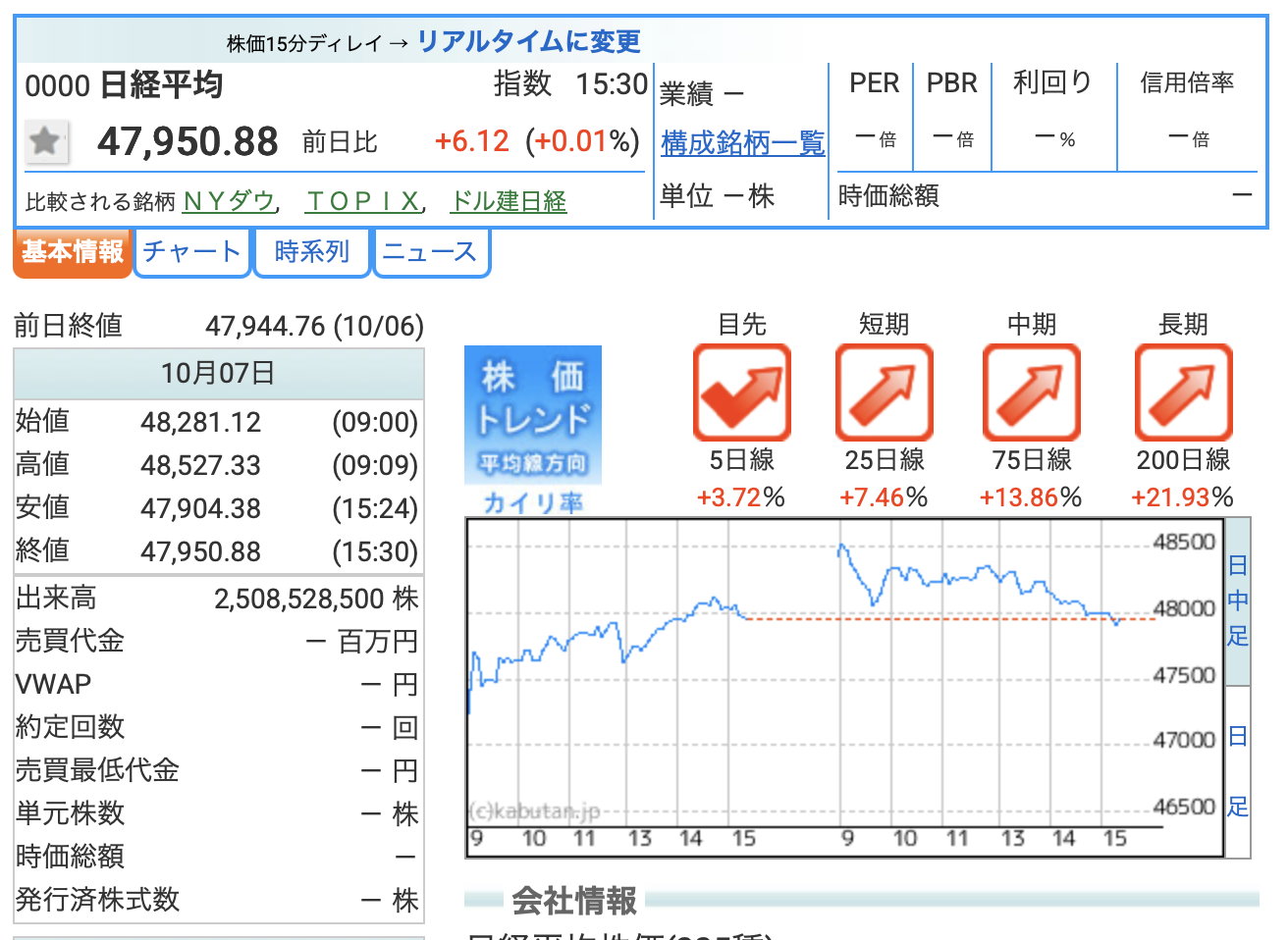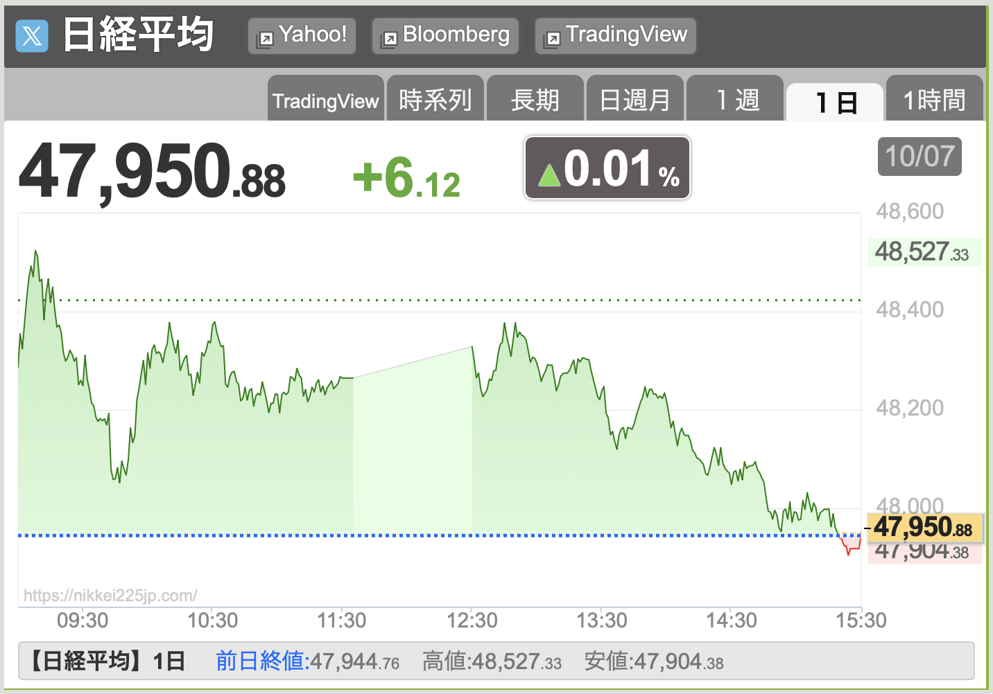 2025年10月時点の筆者の想定レンジは34000〜43000円です。10/7時点、日経終値は47950円です。「だいぶ高いな〜」と思います。