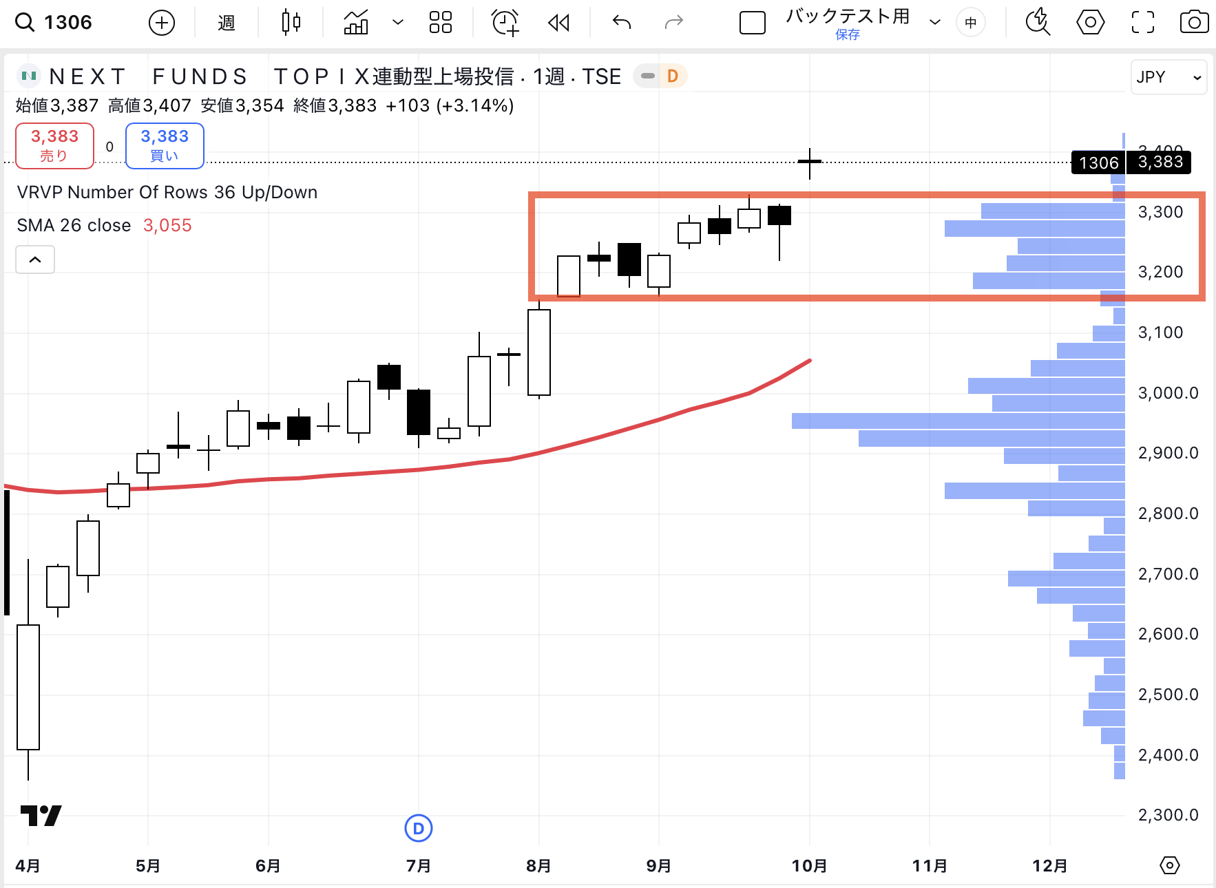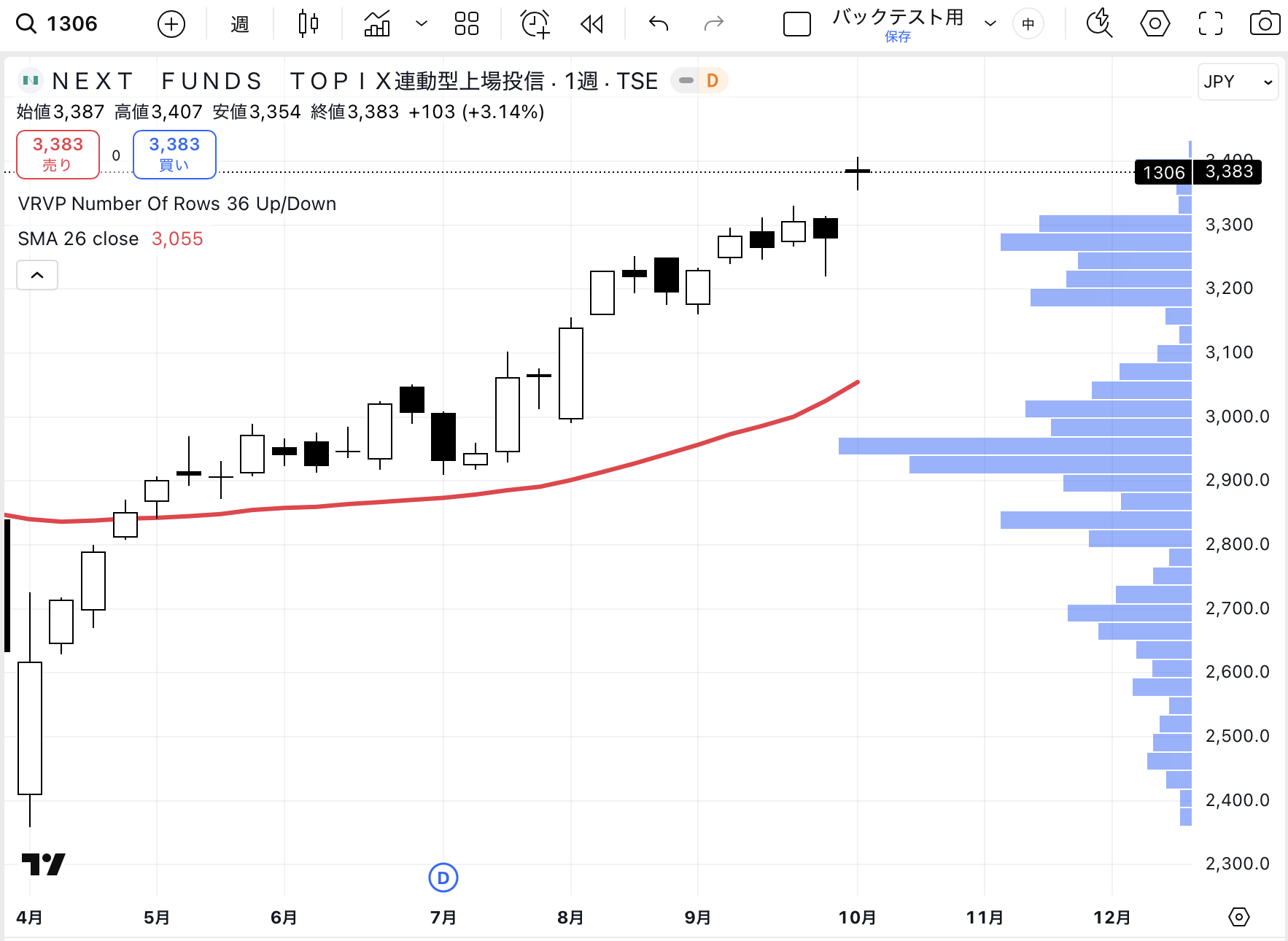 TOPIX ETFのチャートを見ればわかるように、足元の指数は最高値水準です。こういうとき、買いポジの人は「みんな含み益」で、慌てて売る必要がありません。