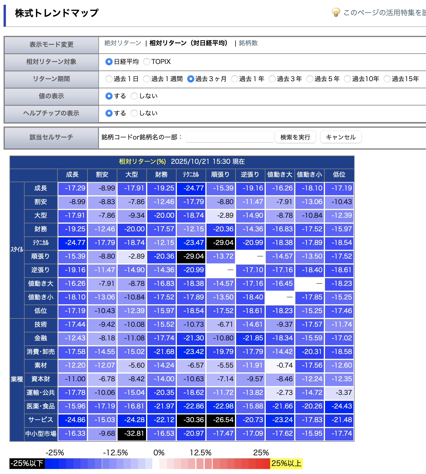 ここ3ヶ月ほどのリターンを見てみると、ほとんど全てのセクターが日経平均株価に劣後しています。