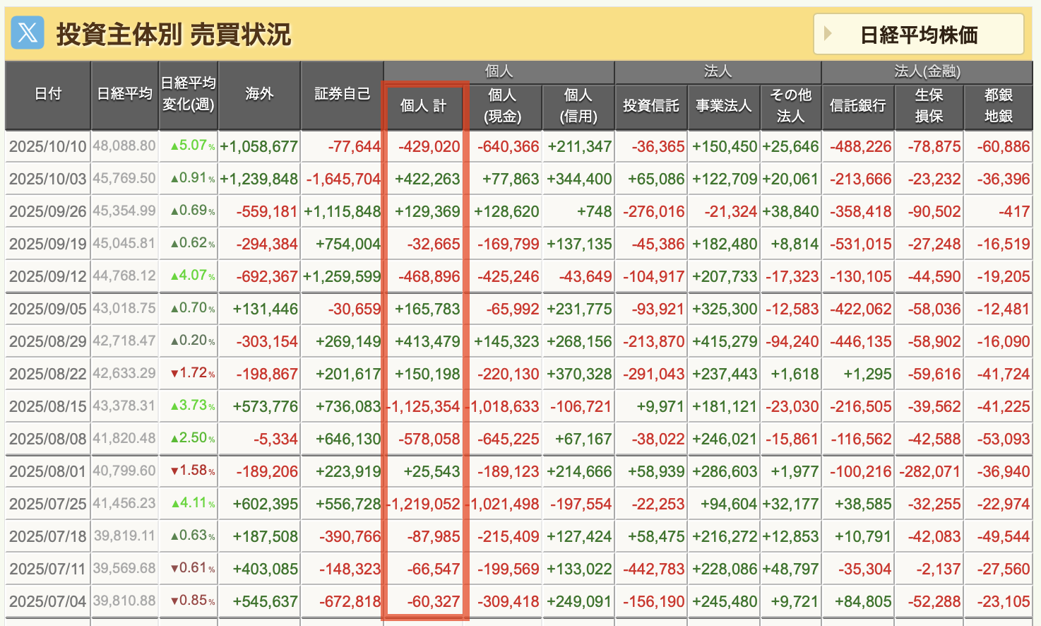 投資別主体売買動向を見てみると、個人投資家は日経平均が4万円をこえてからどんどん売っています。だから、ポジションが軽くて「指数が上がっていのに儲からない」という人も多そうです。