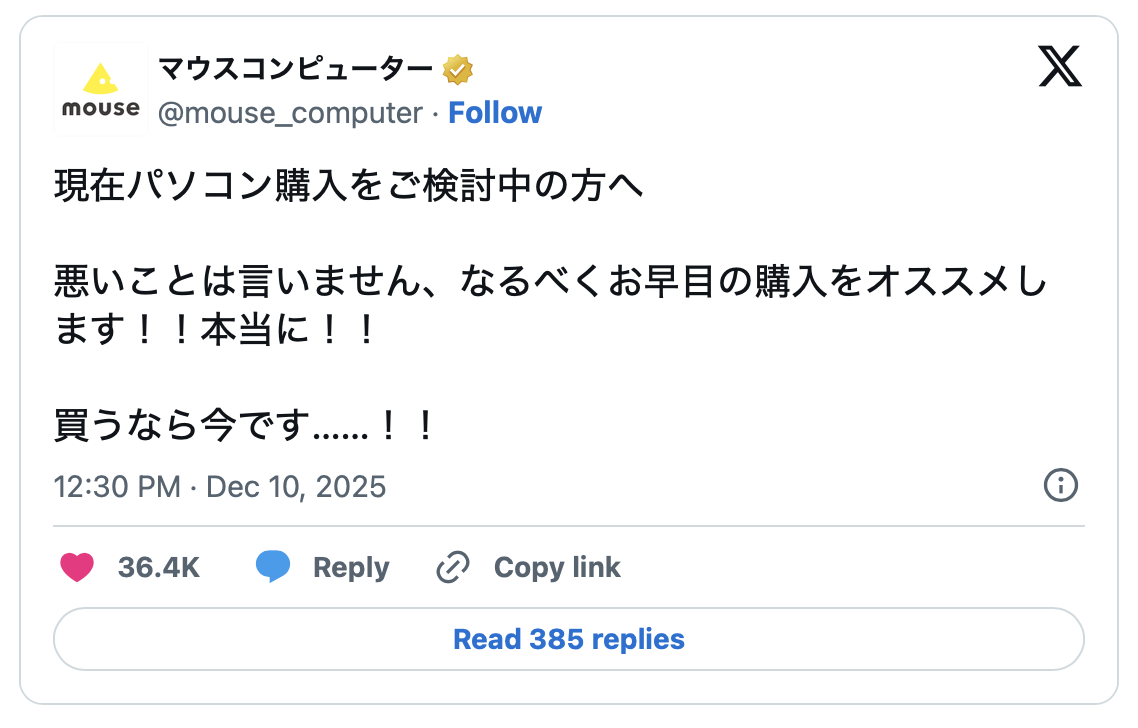 こないだ、Xでマウスコンピューターが「パソコンを買うなら早いほうが良いよ!」とポストしていました。