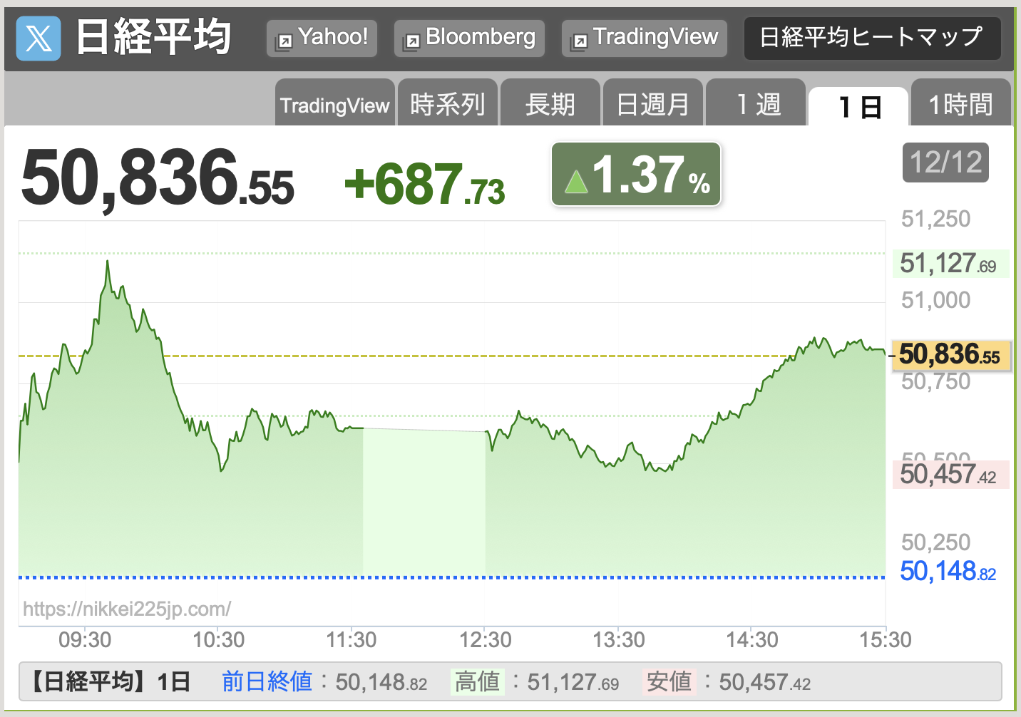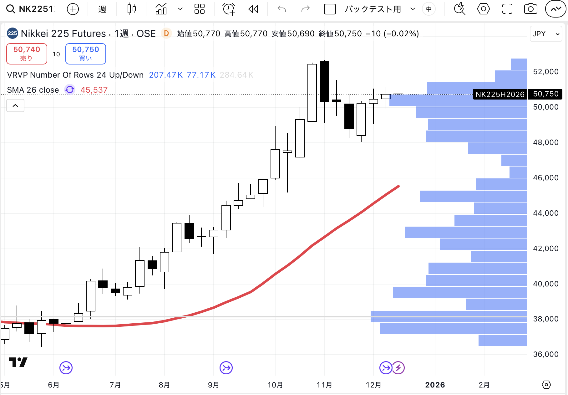 需給面でみると、日経平均は48000円〜50500円のレンジで出来高が集中しています。