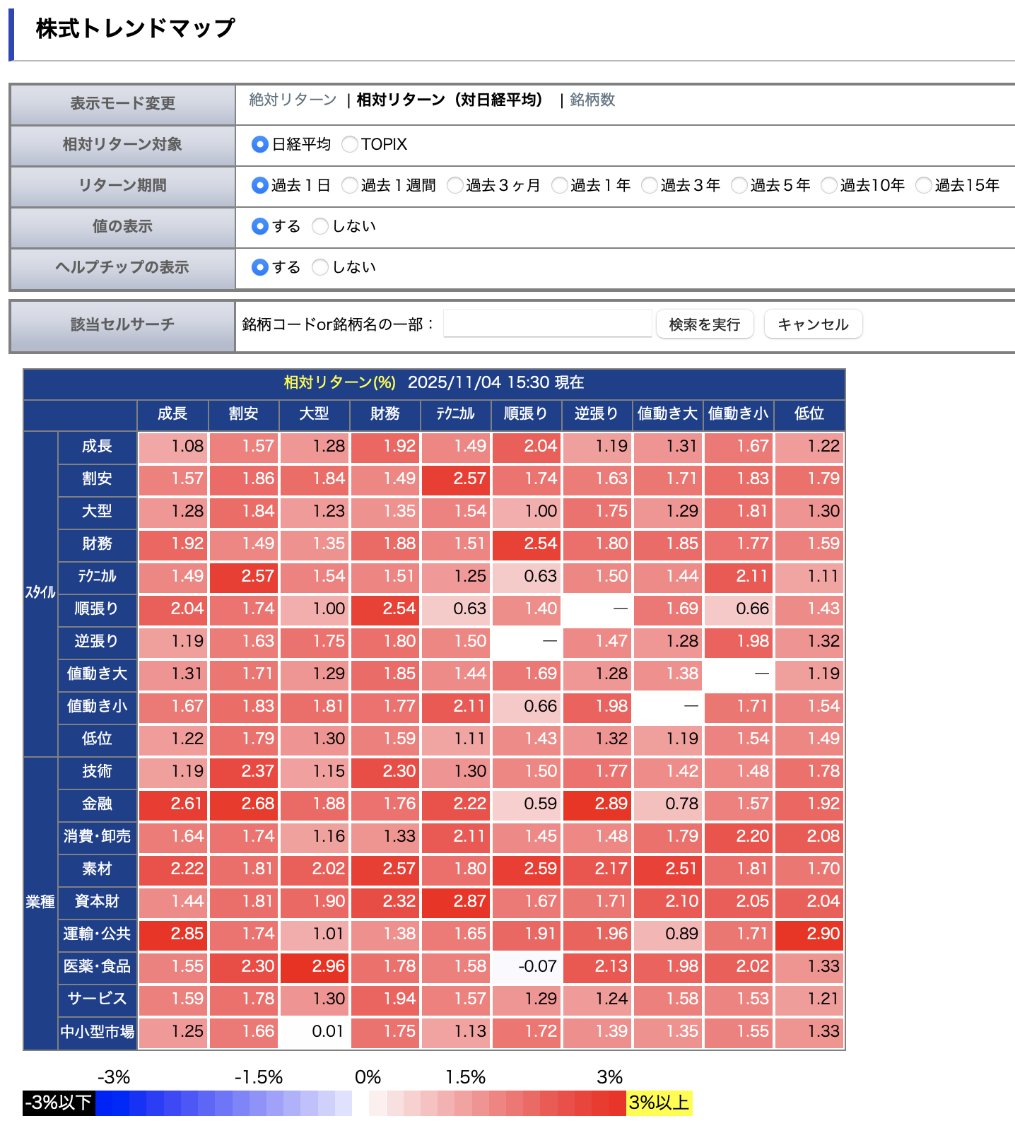 株式トレンドマップを見てみると、個別株は日経平均と比べると強かったですね。決算シーズンもピークが近いですし、いよいよセクターローテーションが始まりそうです。