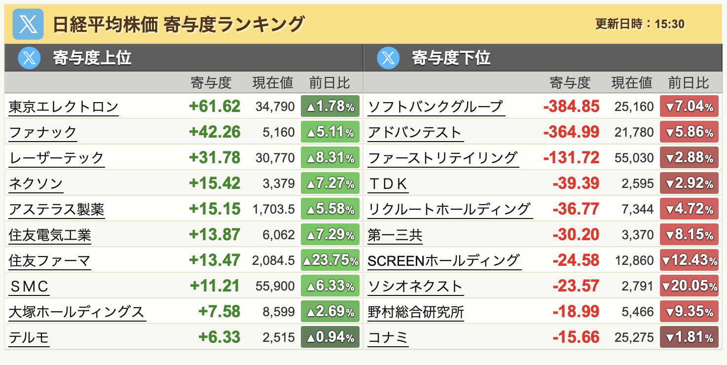 寄与度ランキングを見てみると、これまで日経平均を押し上げてきたソフトバンクグループやアドバンテストの下げが目立ちました。