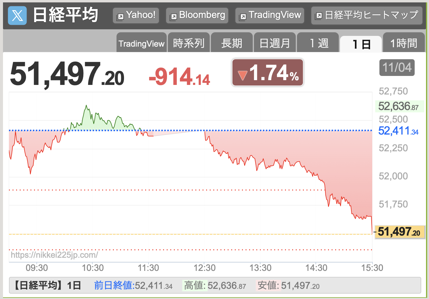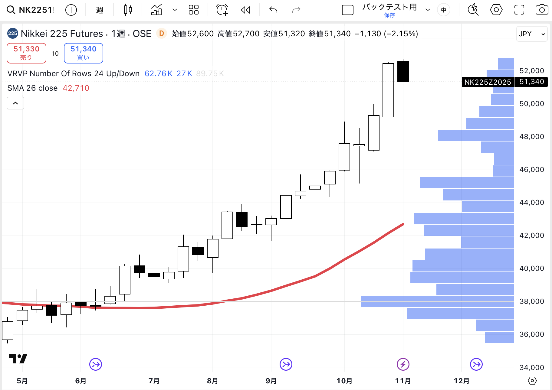 11/4時点、日経終値は51,497円です。かなり高いですね。