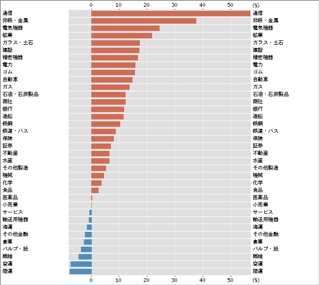 足元3ヶ月の業種別リターンをみると、ソフトバンクグループが牽引した通信、フジクラやJX金属が牽引した非鉄金属、AI半導体関連銘柄が豊富な電気機器セクターが強かったです。