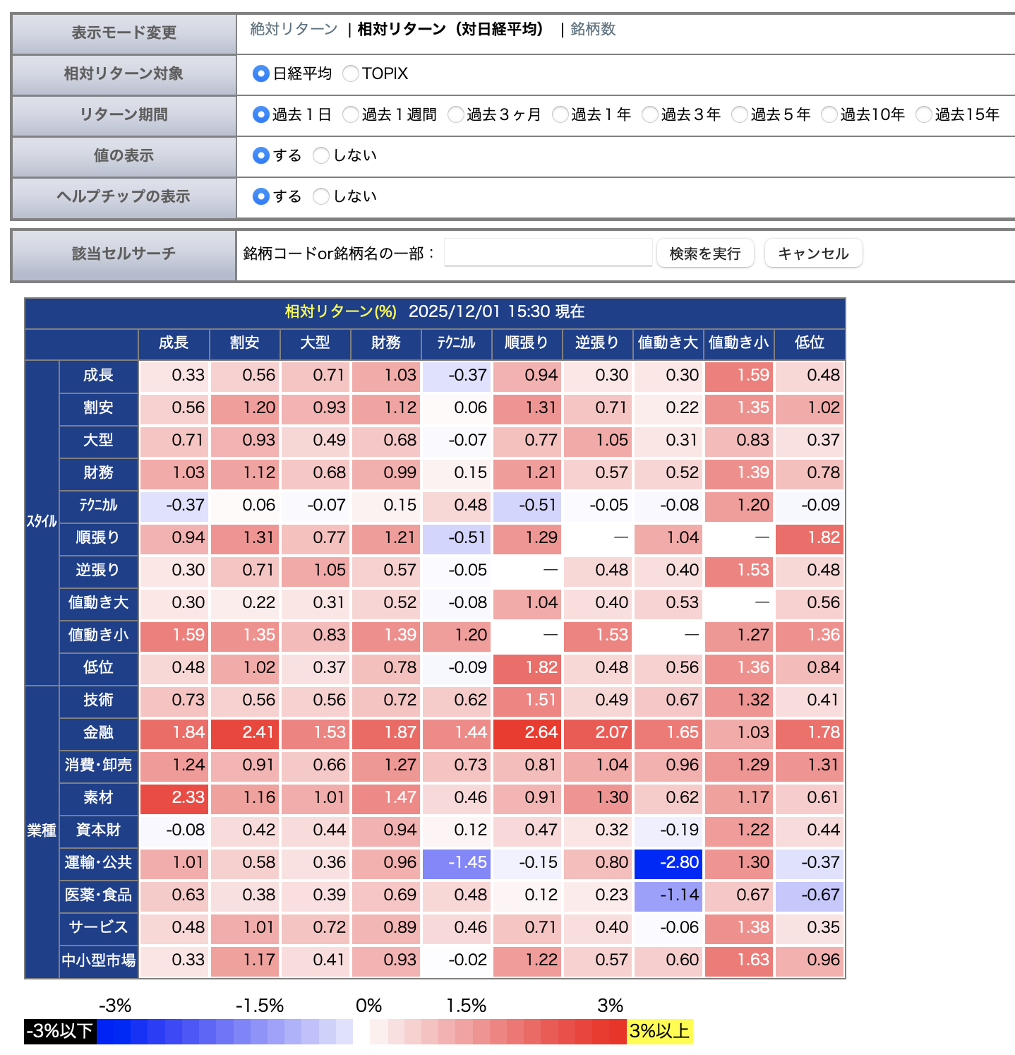 株式トレンドマップを見てみると、12/1は日経平均株価が特に弱く、それ以外は(下がったとはいえ)しっかり持ち堪えました。