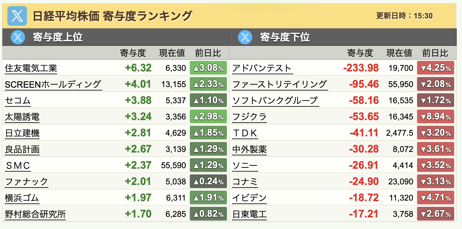 寄与度ランキングを見てみると、アドバンテストやソフトバンクグループ、フジクラ、イビデンなどのAI関連銘柄がキツく下がっていました。