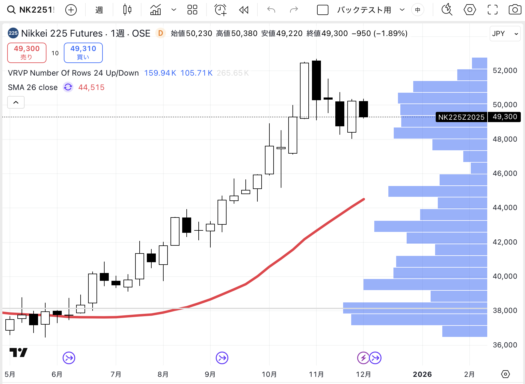 需給面でみると、日経平均は48000円〜50500円のレンジで出来高が集中しています。