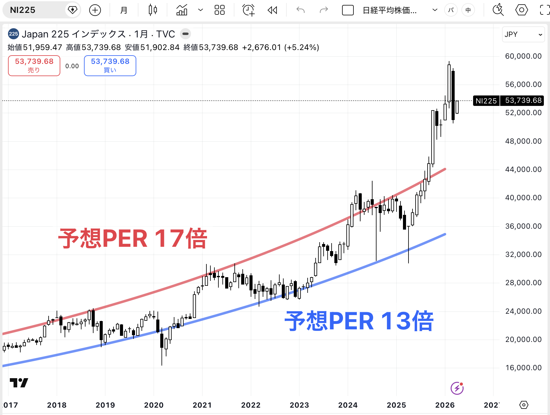 ここ10年ほど、日経平均の予想PERは13〜17倍のレンジで推移しています。