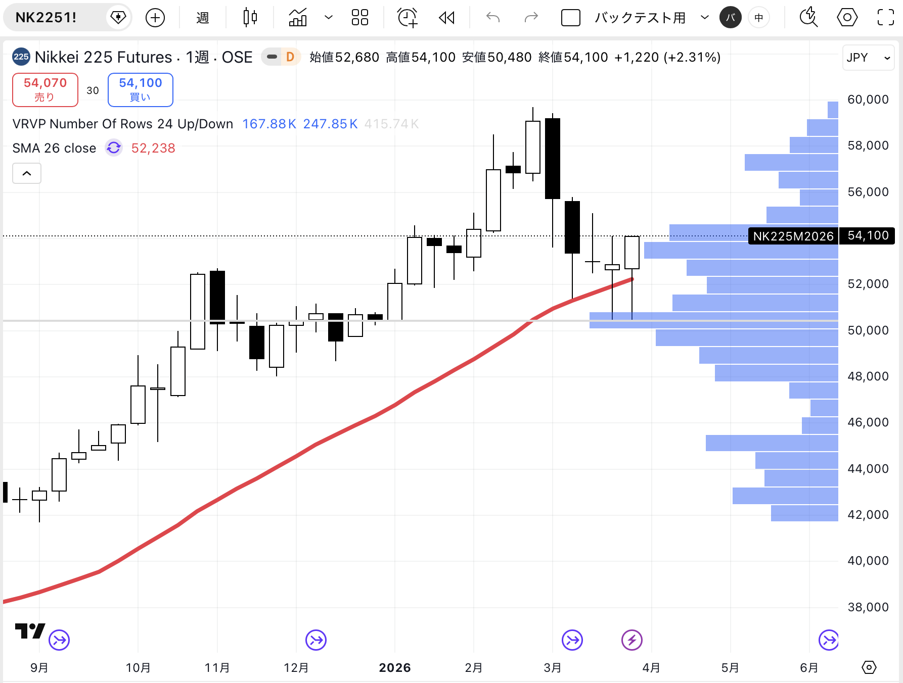 これは日経平均先物の週足チャートです。去年9月以降の価格帯別出来高をみると、50000〜54000に分厚い出来高があります。