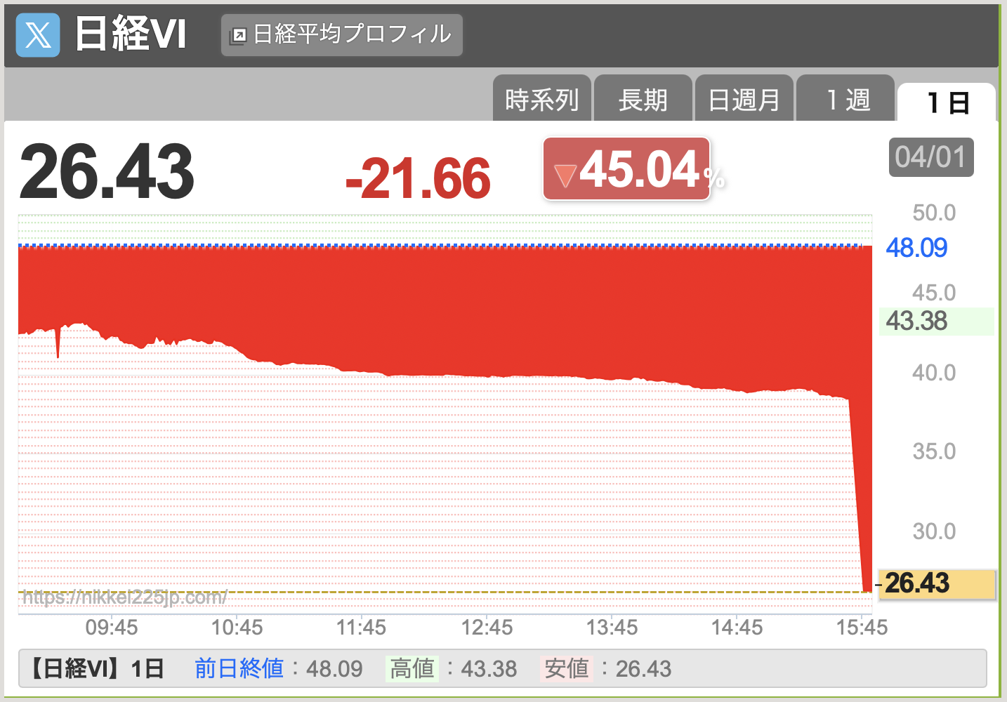 昨日のブログでは「日経平均の恐怖指数(日経VI)が48になっており、これは1日あたり3%の上下を見込む高すぎる数字だ」なんて話をしました。