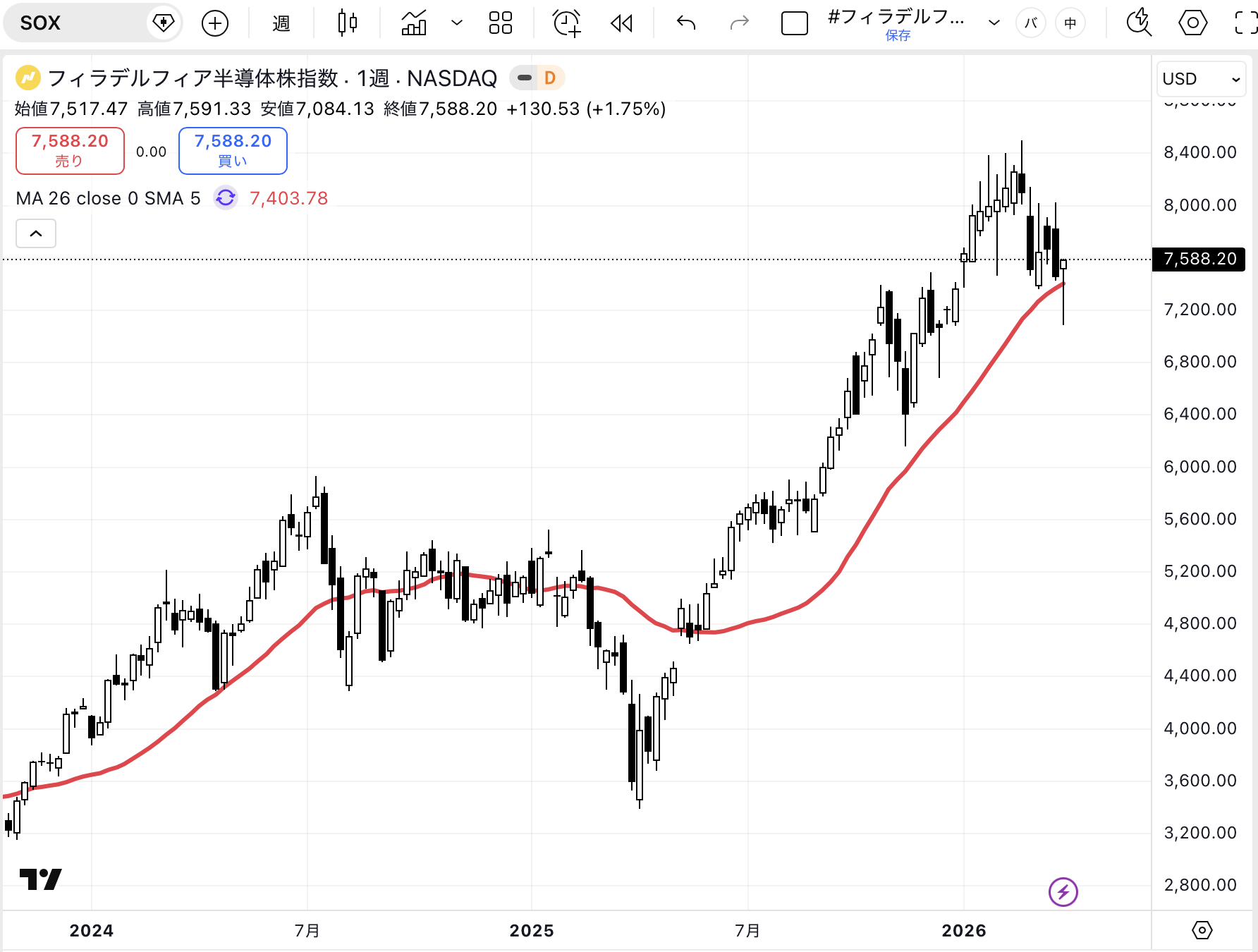 日本株に先行するフィラデルフィア半導体株指数(SOX)も急激に戻しており、26州移動平均を回復しました。