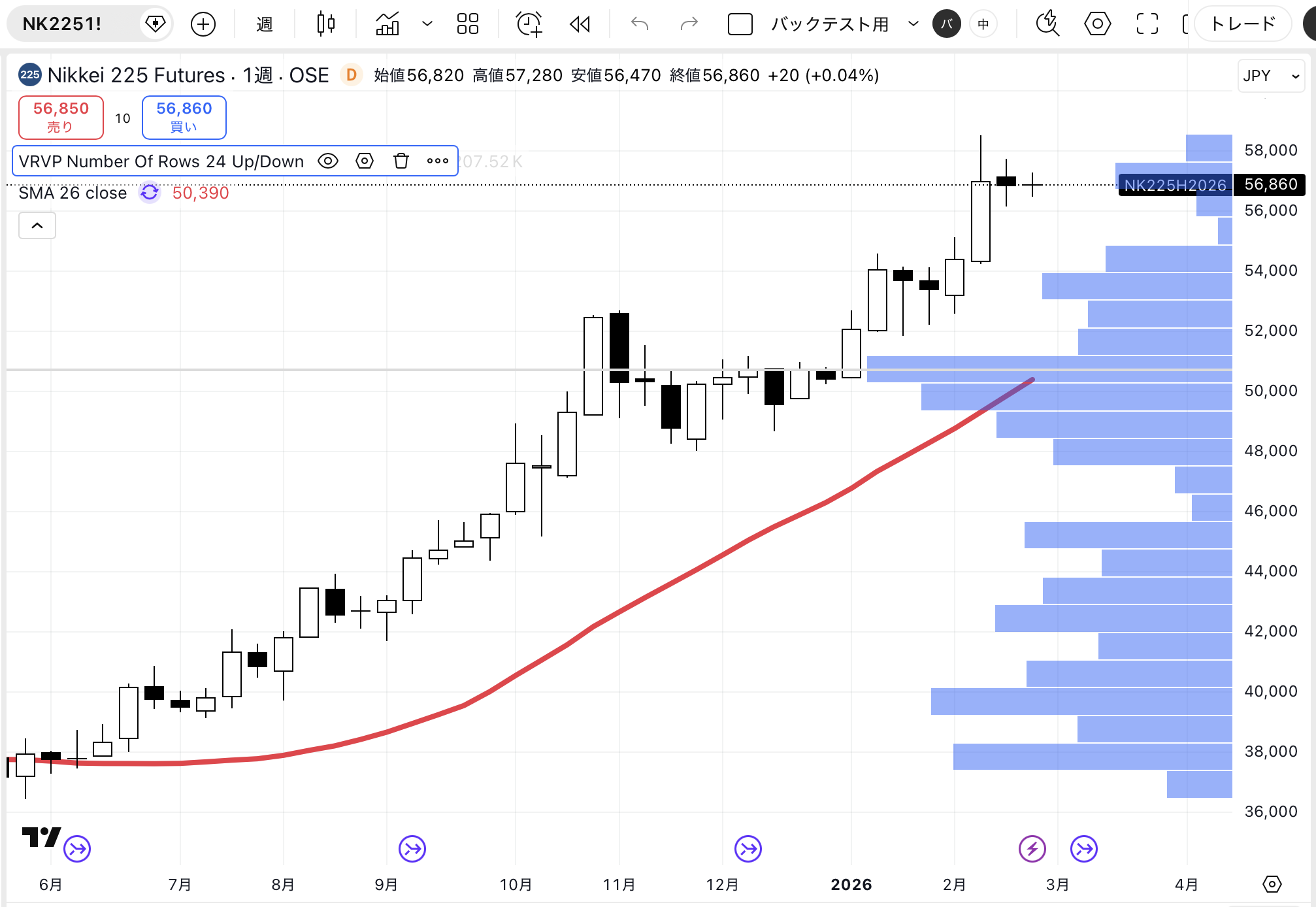 右側の青い線が価格帯別出来高です。表示しているチャート期間中の出来高を、価格帯別に集計しています。