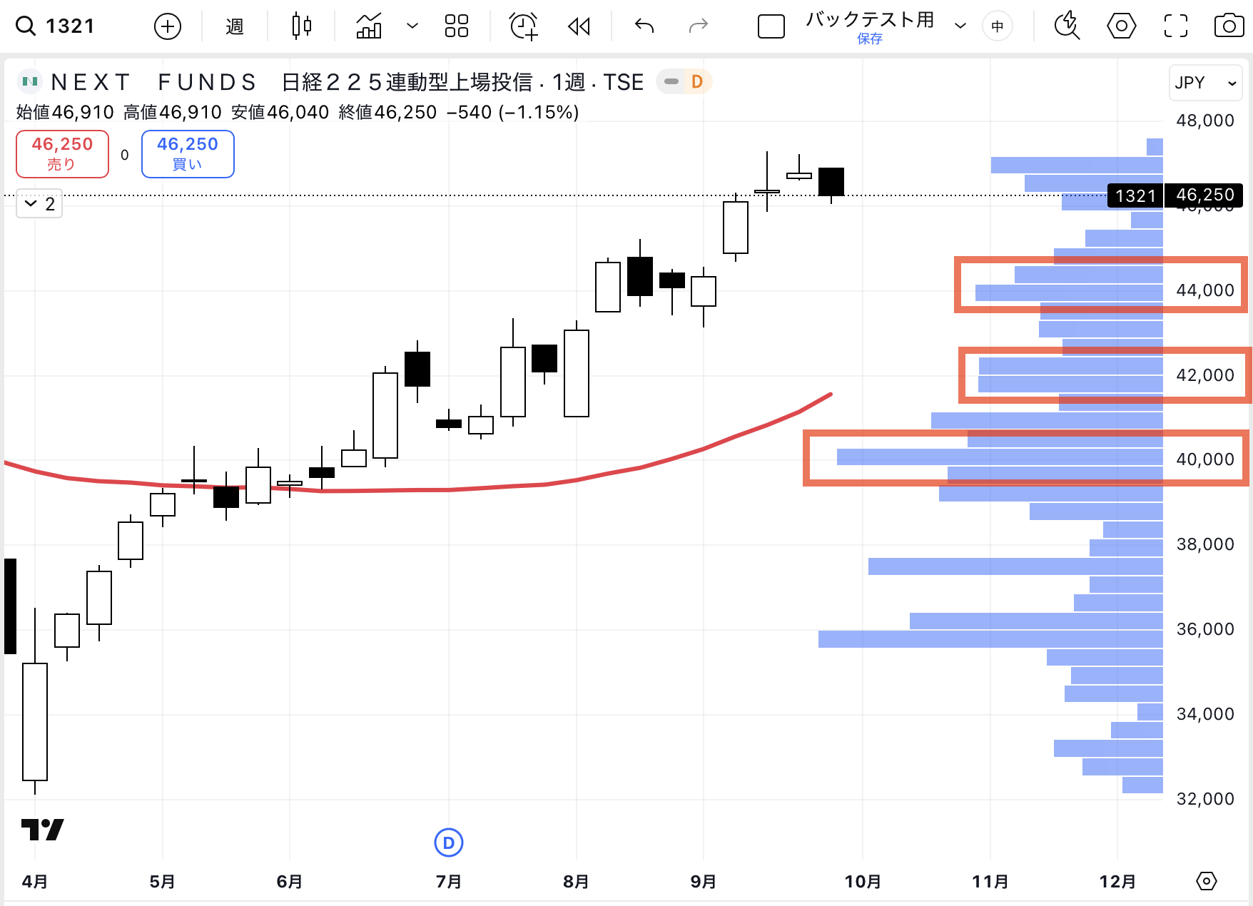 日経平均ETF(1321)の価格帯別出来高を見てみます: