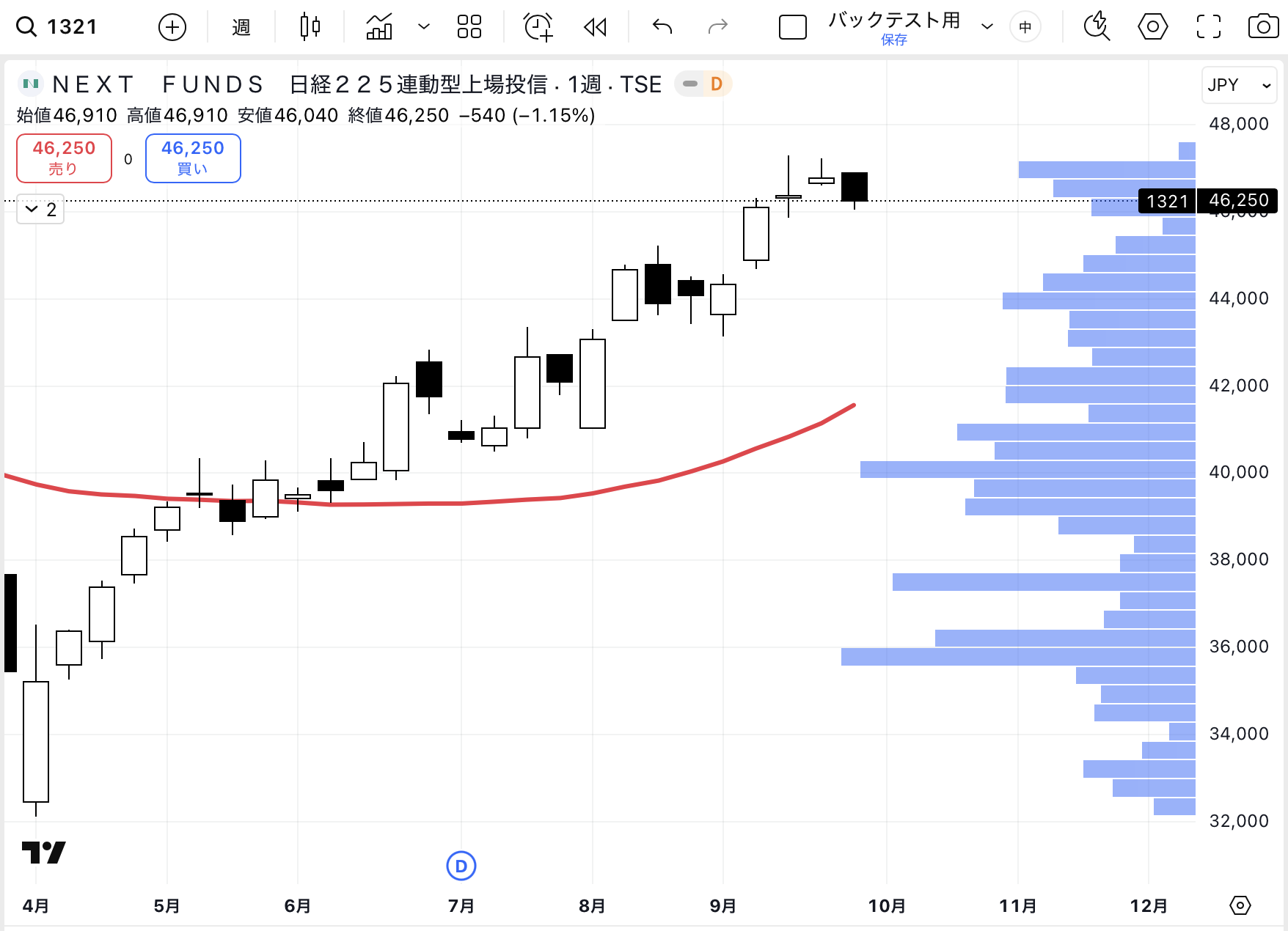 日経平均ETFの需給は「ちょっと崩れてきたかな?」というふうに見えます。9/26の下げを受けて、結構分厚い出来高の層が上側にできましたね。