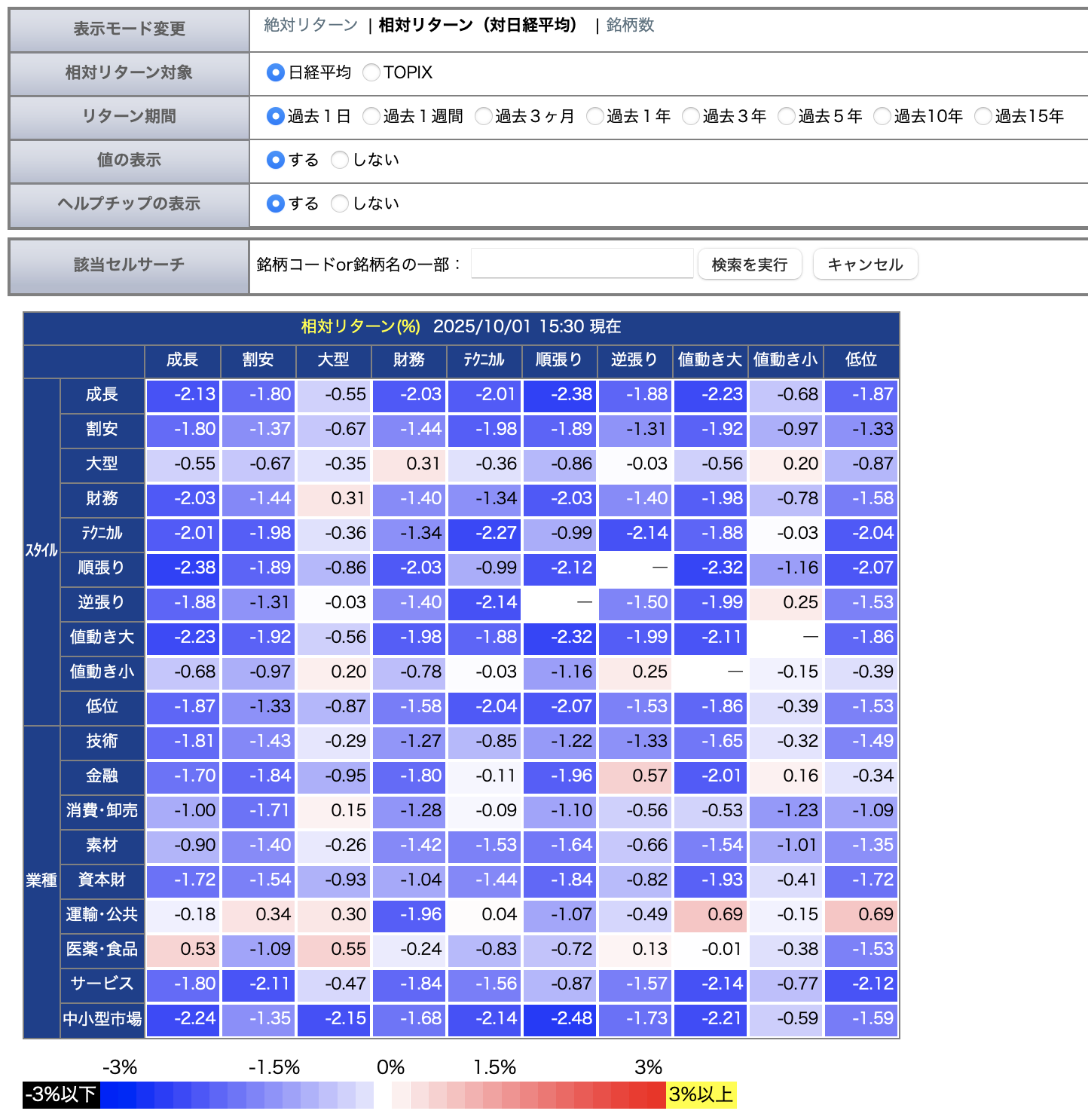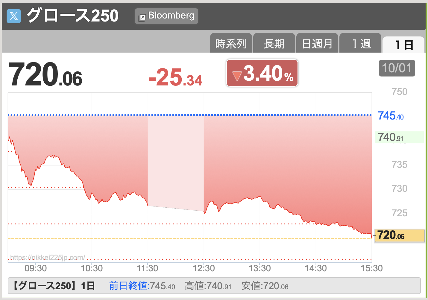 10/1は指数が崩れたというより、株式市場全体が崩れた1日だったように見えます。うちのポートフォリオとしても、「日経平均株価1%弱しか下がってないけど、うちの持ち株の下げ方はもっとやばい!」という感じです💦