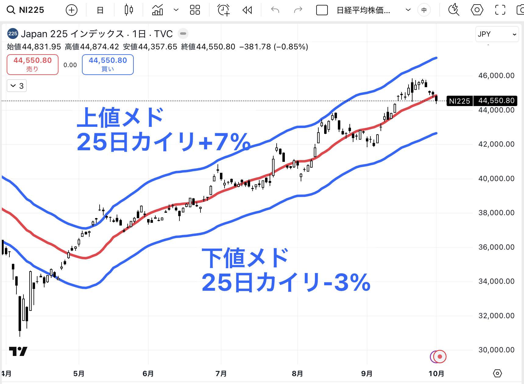 目安としては、25日平均から「+2%〜7%」が適温相場で、そこから崩れて「-3%〜+2%」となると急に弱くなる傾向があります。