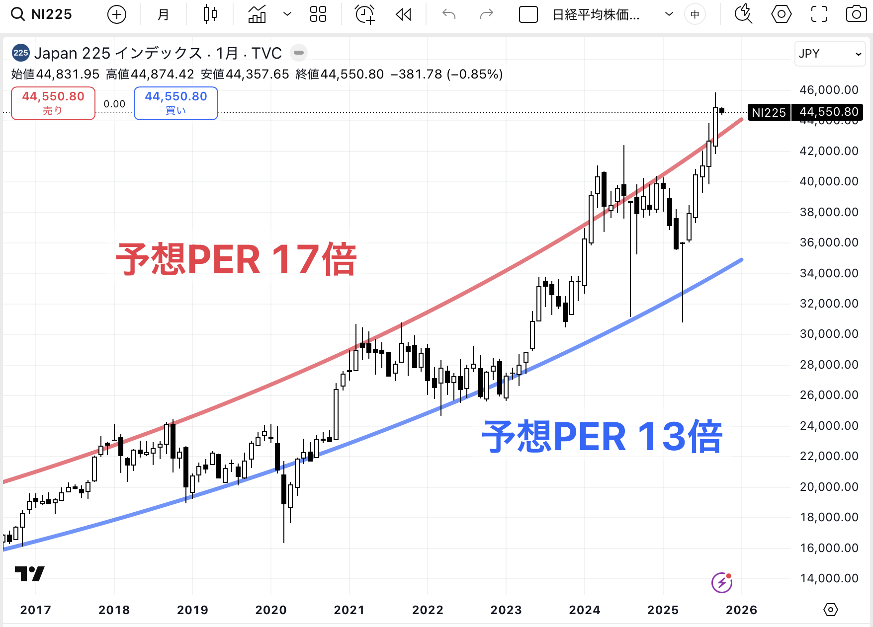 2025年10月時点の筆者の想定レンジは34000〜43000円です。10/1時点、日経終値は45550円です。「だいぶ高いな〜」と思います。