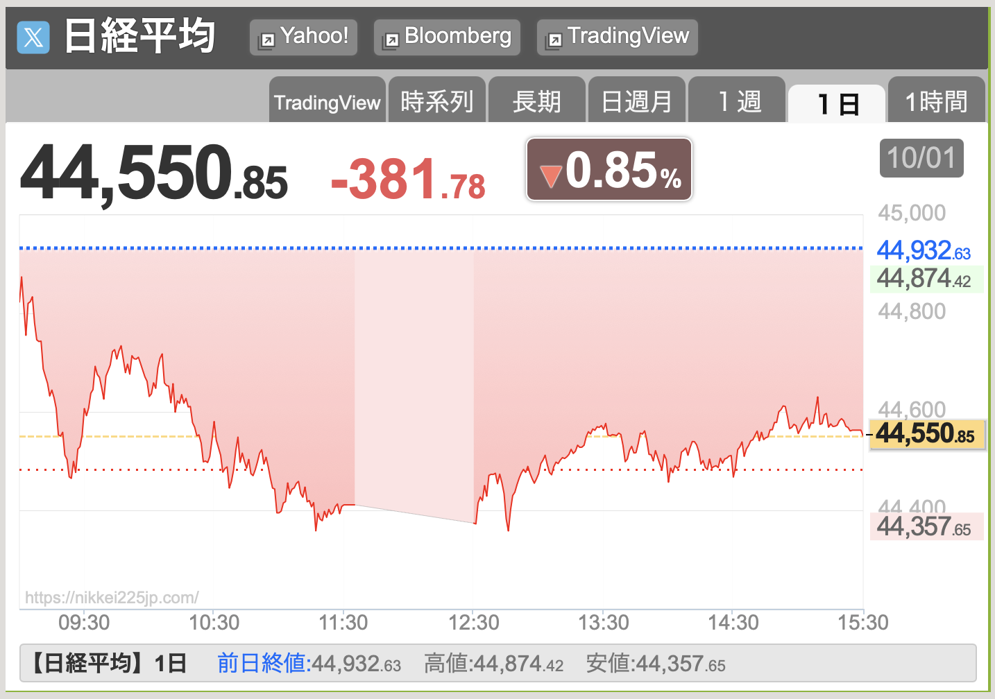 日銀短観もサプライズではない気がしていて、総裁選についても同様の認識です。「10月初めは何故か弱い」みたいなアノマリーもあるみたいなので、10/1の下げは「短期的な需給要因じゃないかなー」と感じます。