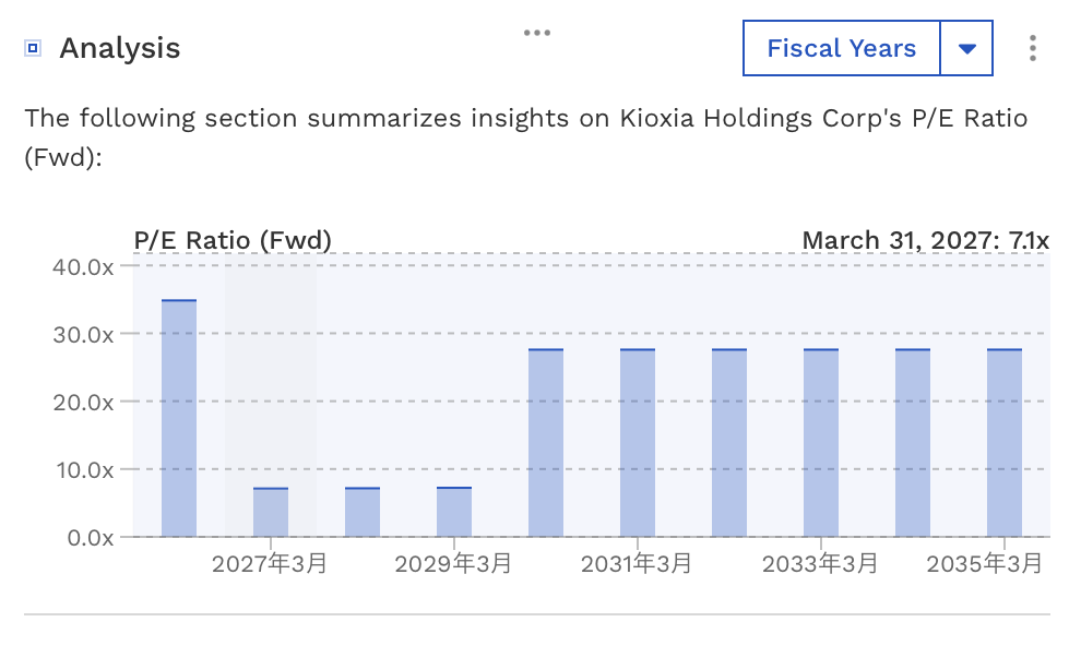 FINBOXでキオクシアのフォワードPEを確認したみたところ、2027年3月期の予想PERが7倍でした。あっているかはわかりませんが、仮に正しいならめちゃんこ安い。